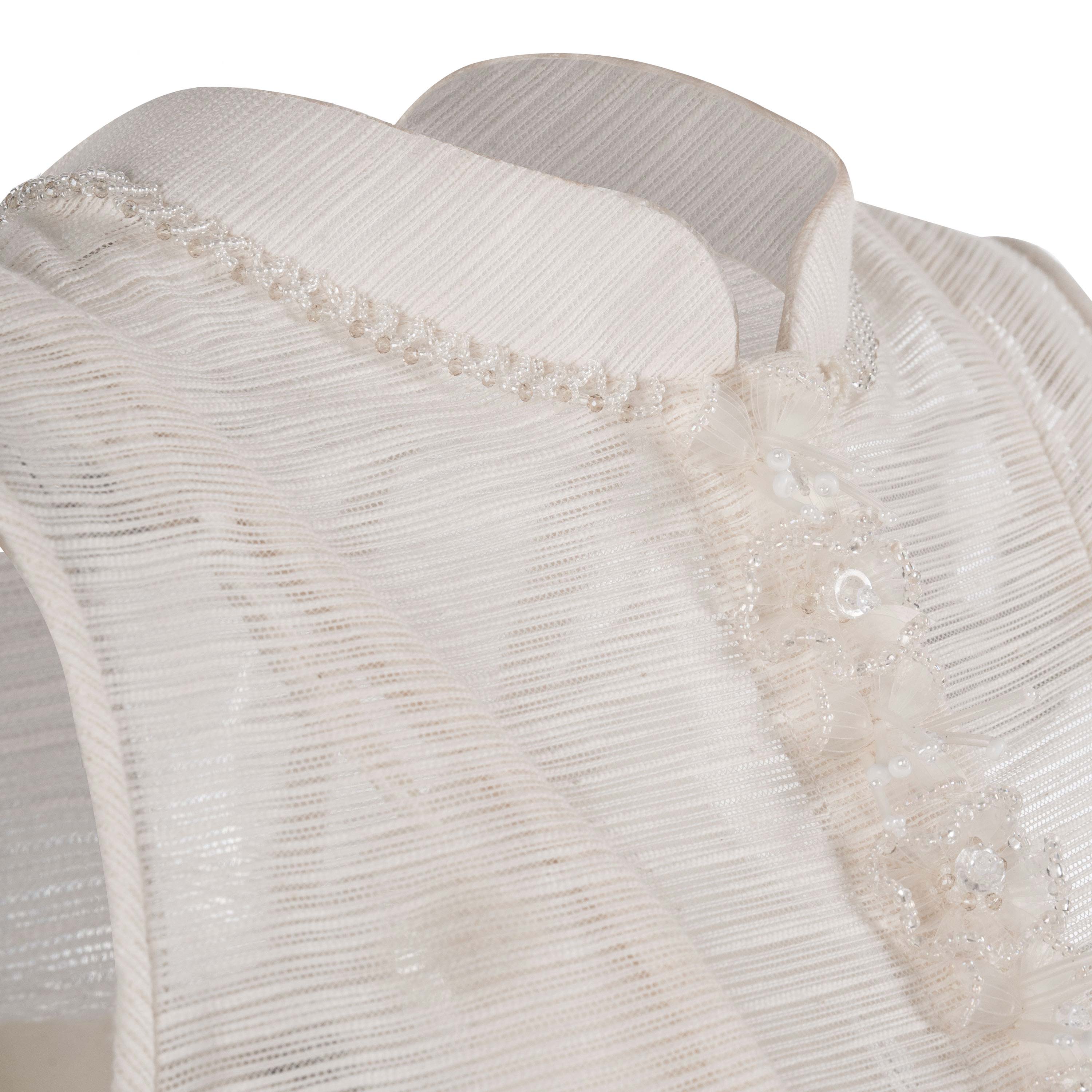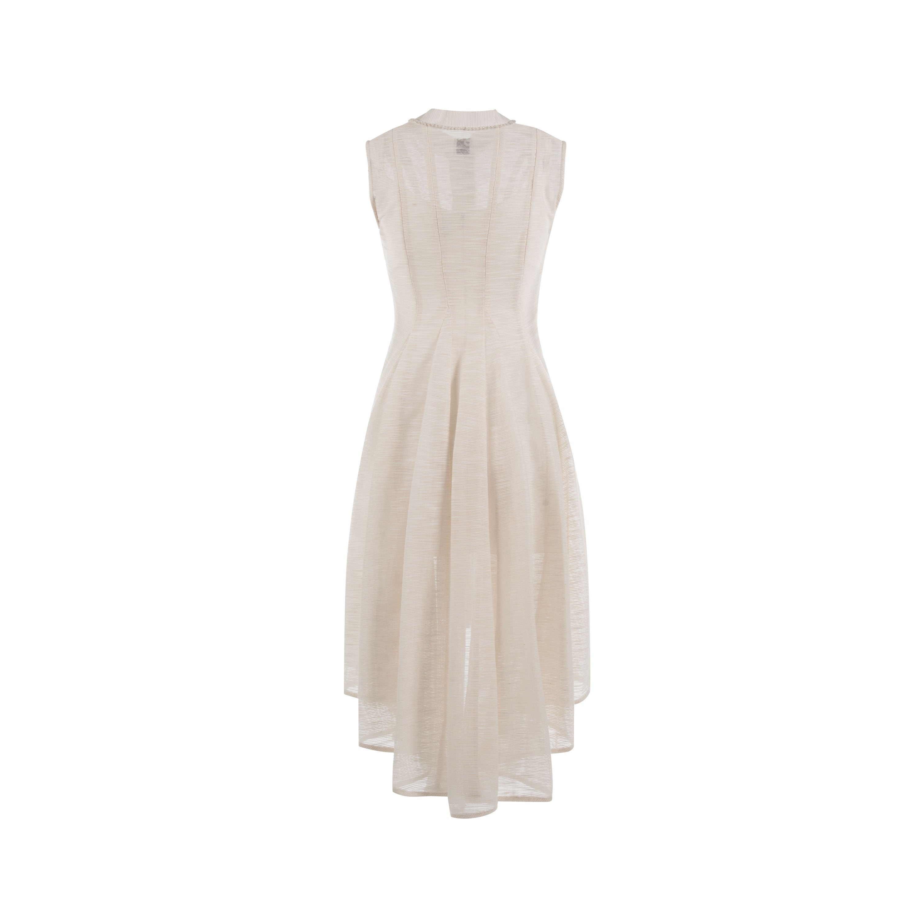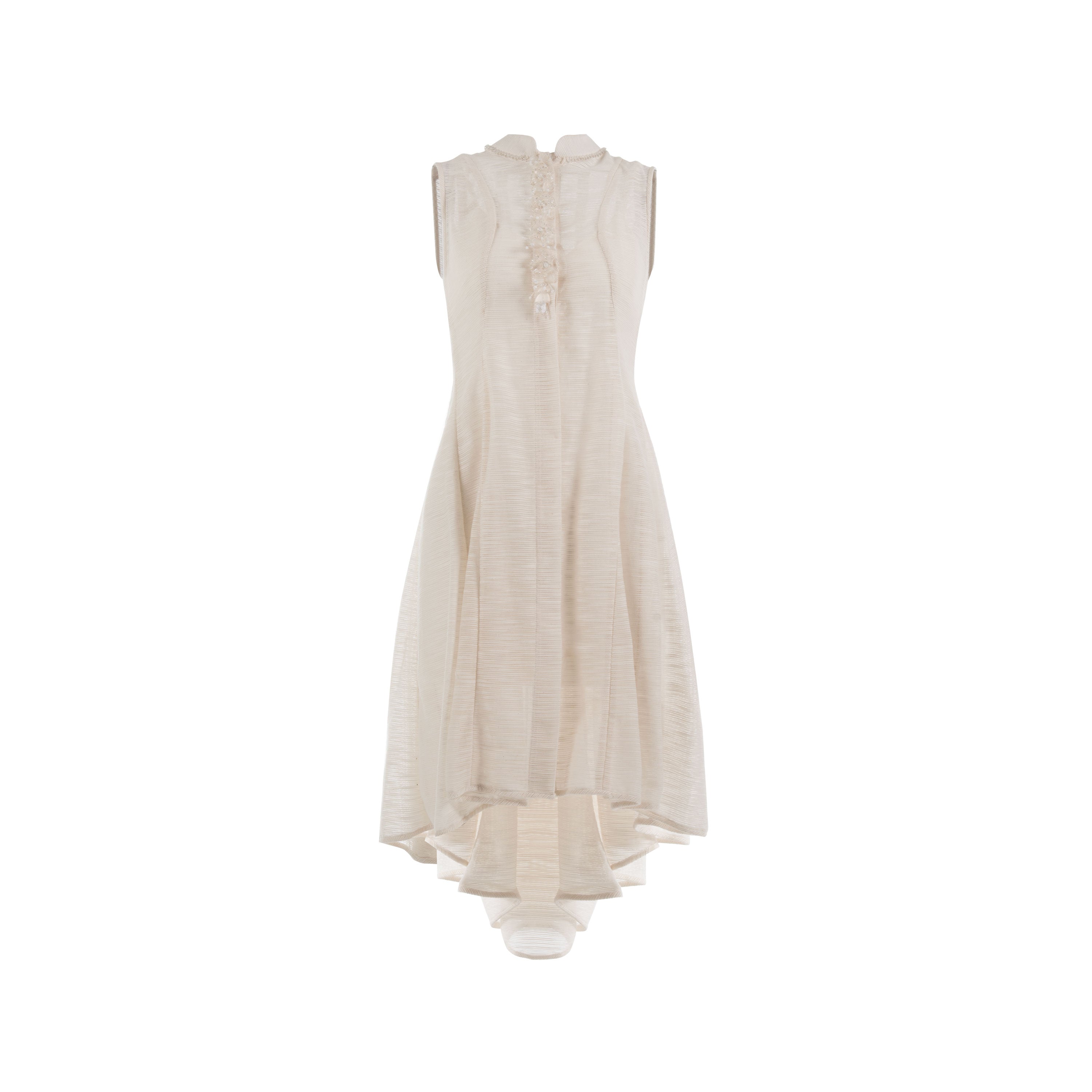 This sleeveless shirt dress features a high collar and hidden buttons. The button tab is adorned with a series of 3D floral embellishments. At the back, there is a wide godet that adds volume to the silhouette. A matching camisole is included with this garment.