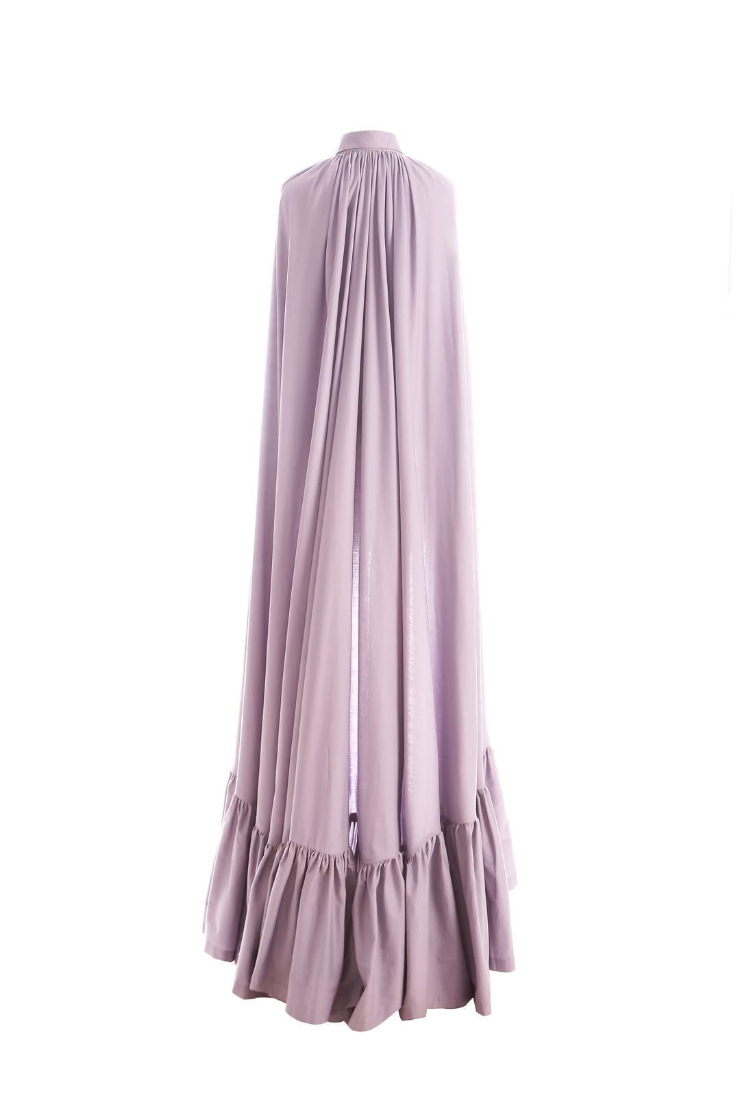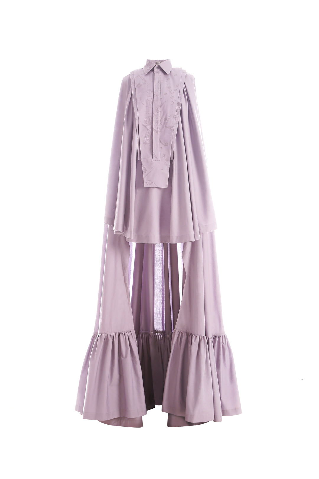 A-line dress with drapery shape, two layered bib at the front with embroidery fabric, back length longer than front length, gather cutting detail at back hem part, hidden button opening at the front side.