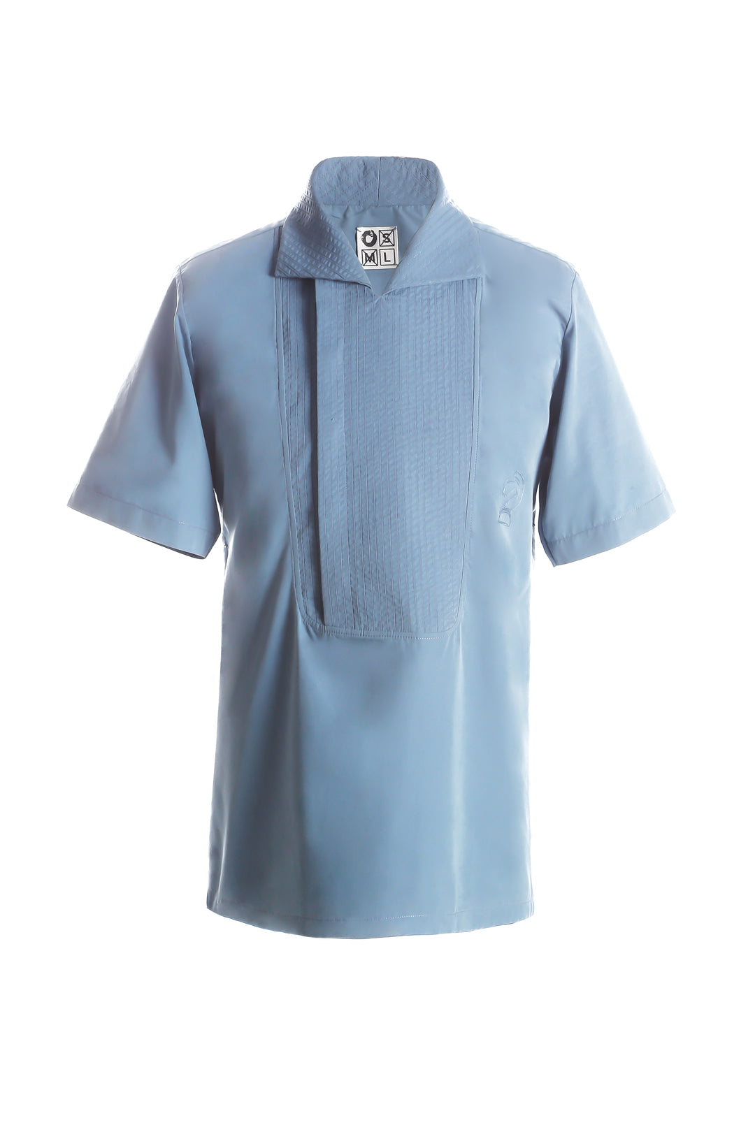 Opnaisel bib detail at the front, wide wings collar, short sleeves, back length longer than front length, orange vegan leather detailed on hem sideslit