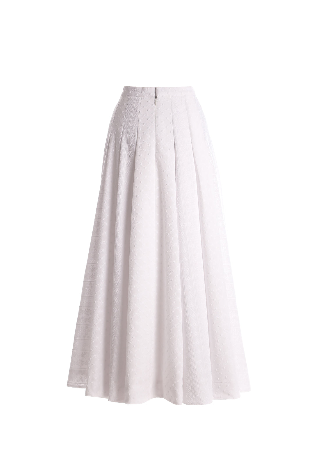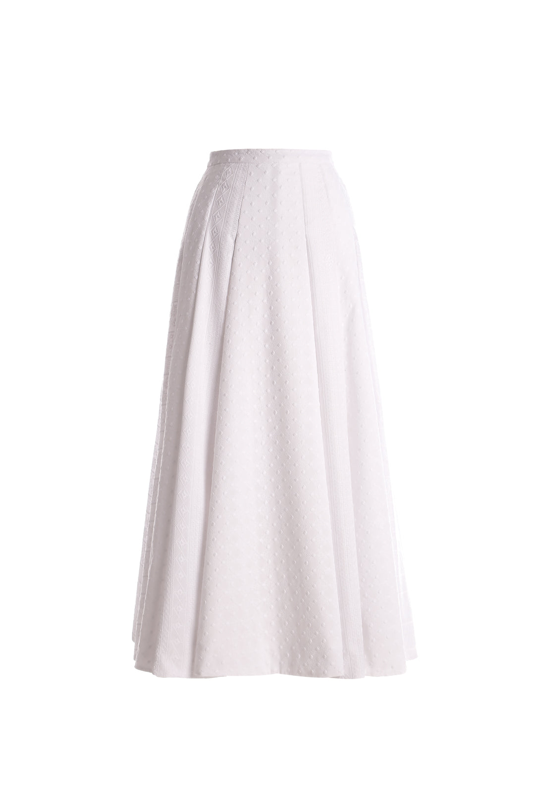 Midi length A-line skirt, combination of different pattern texture of fabric on each panel, knife pleats detail, layered with inner lining, hidden zipper at the back.