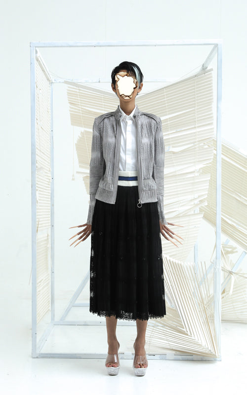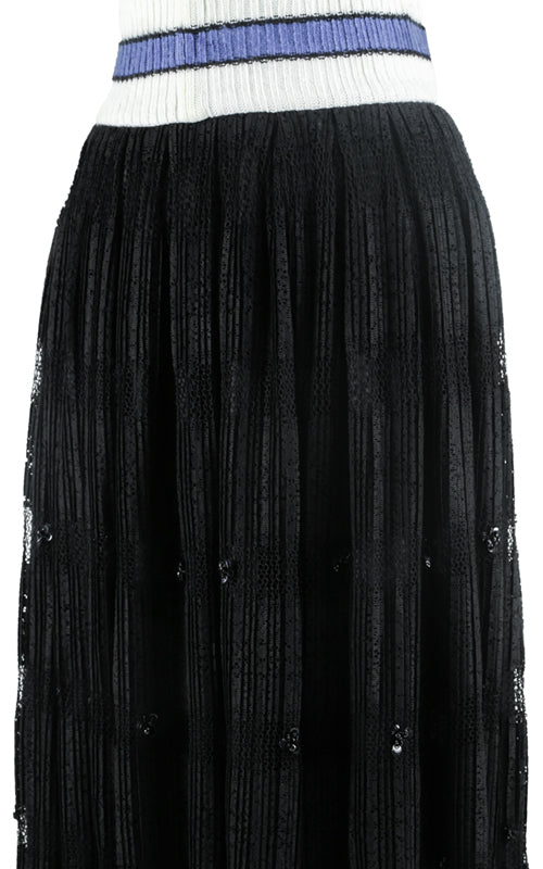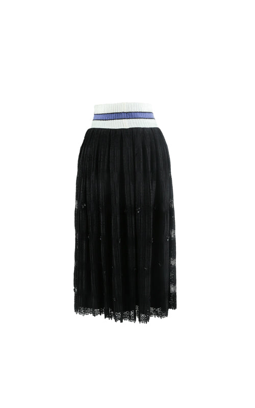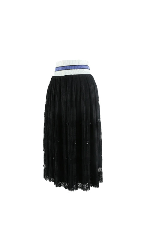 Sweater ribbed waistband with embellished pleated lace and zipper opening at the back.