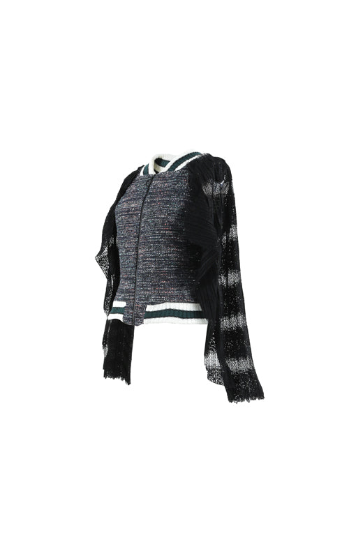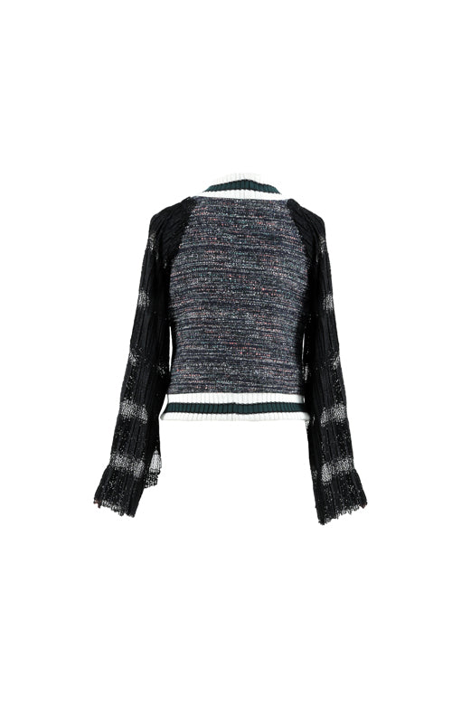 Sweater ribbed collar and hem, with patch on pleated lace slevees and front zipper opening.