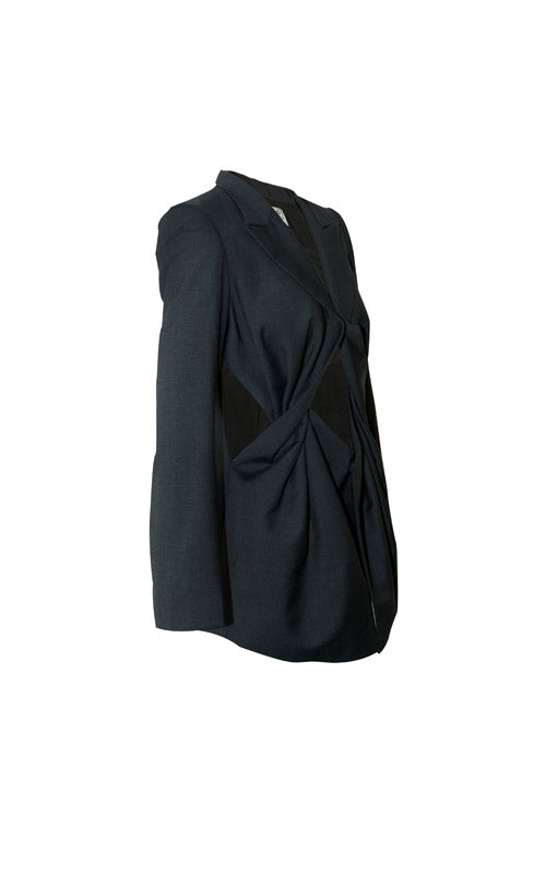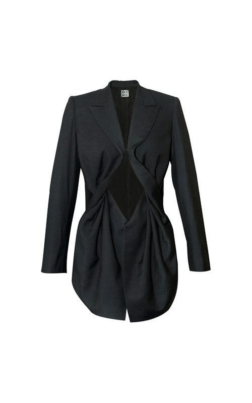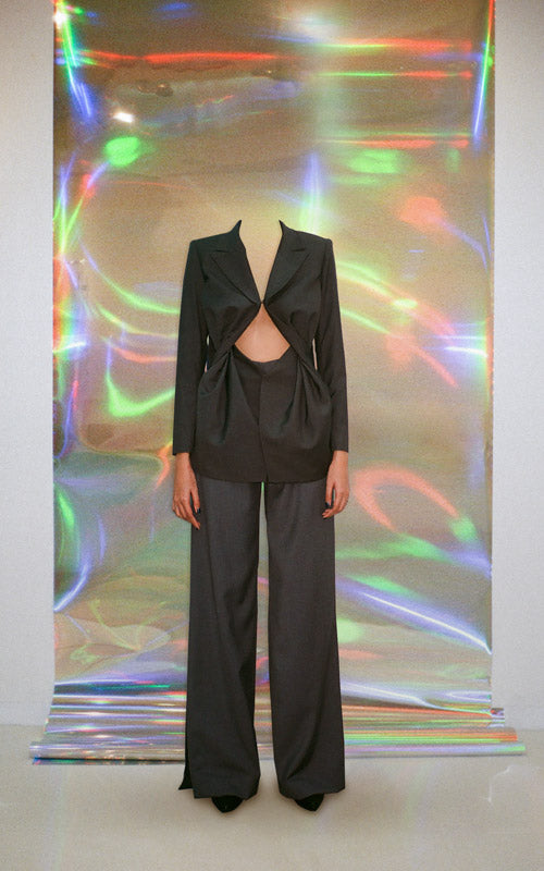 Embracing the spirit of Javanese fabric drapery, we twisted the fabric, creating a geomatric drape-like pattern at the waist. Hook and button at the centre as opening.