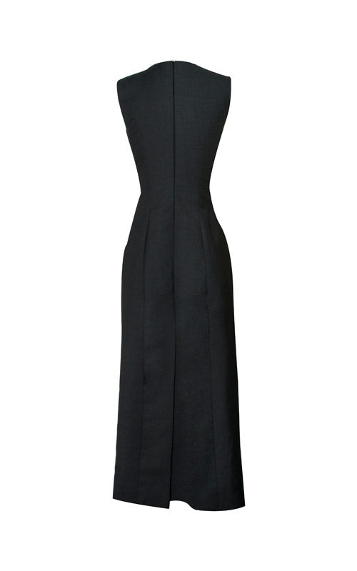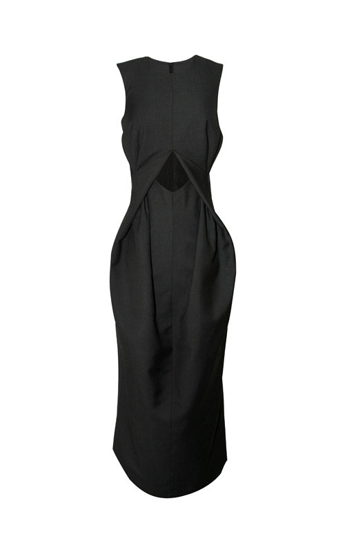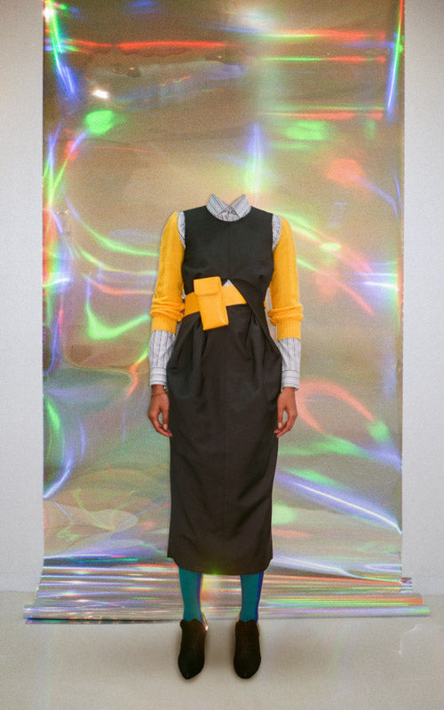 Embracing the spirit of Javanese fabric drapery, we twisted the fabric, creating a geomatric drape-like pattern at the waist. Hidden zipper opening at the back of the dress with an overlapped slit.