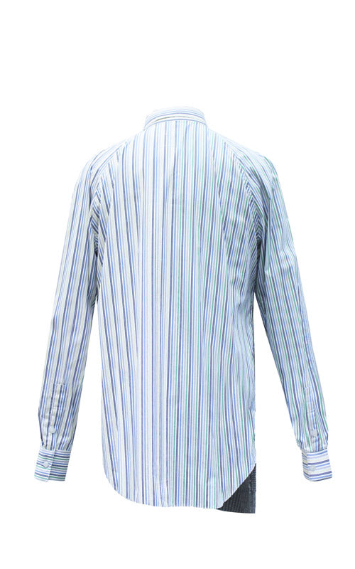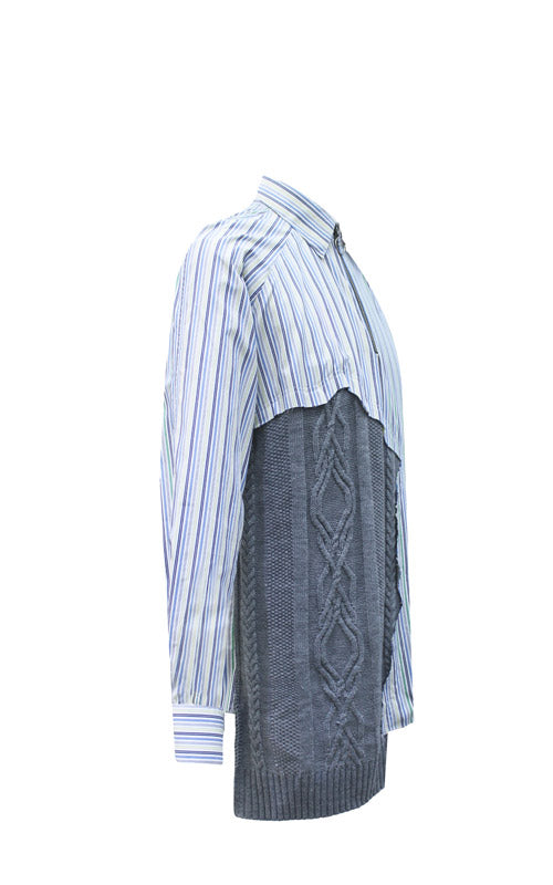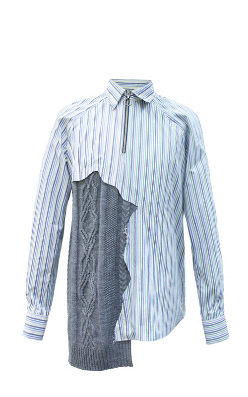 Shirting fabric combined with cable knit fabric on one side, zip up opening through the collar.