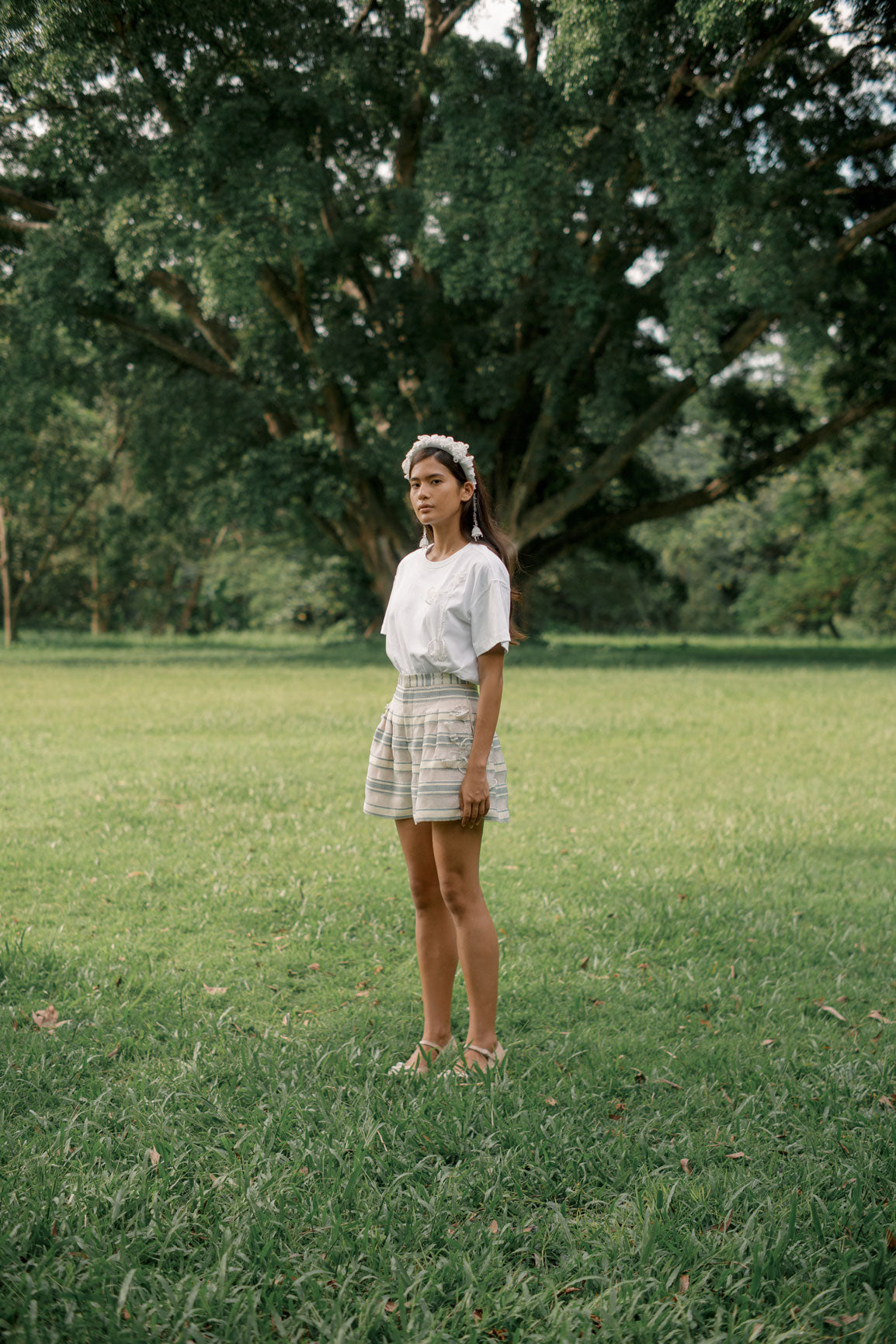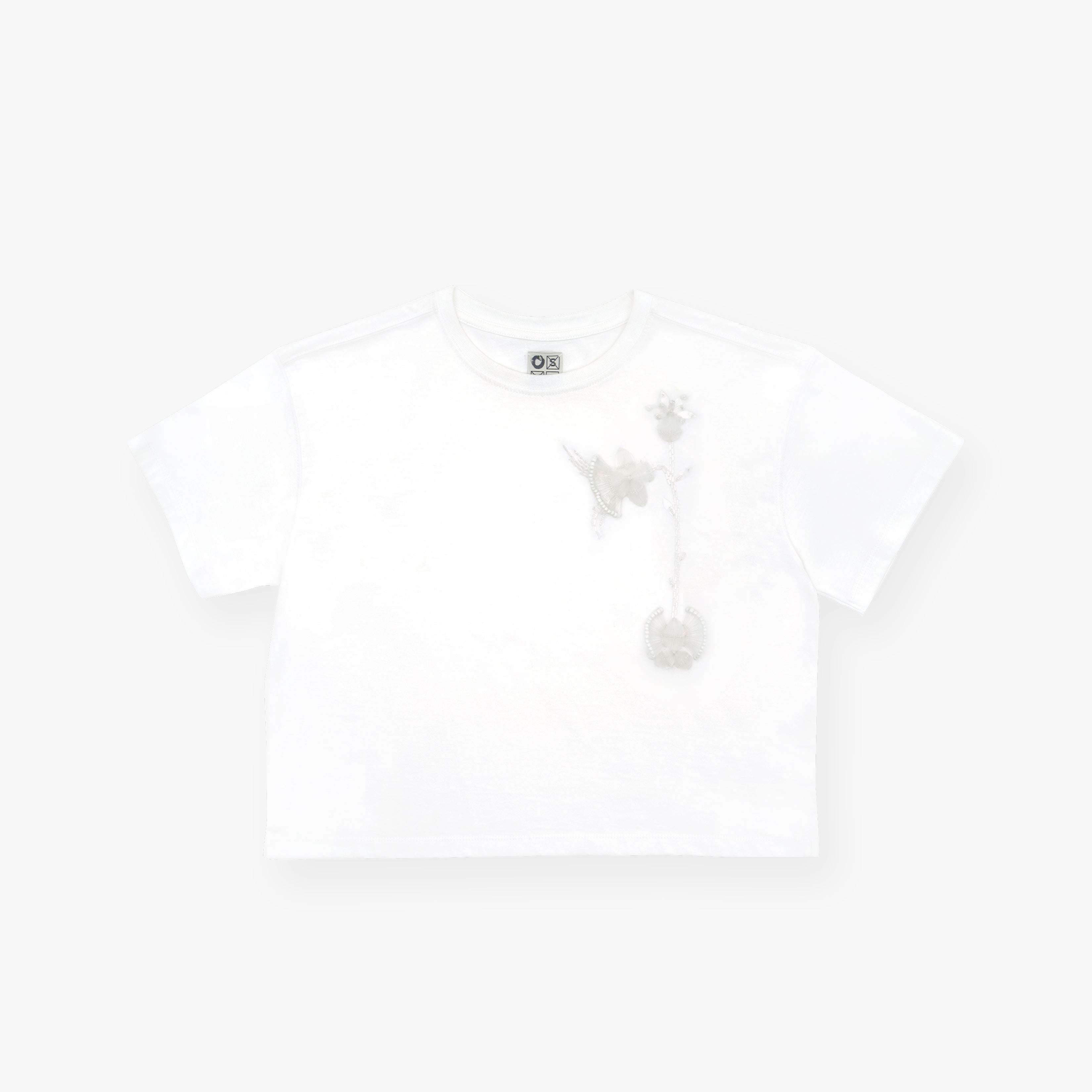 Cropped cotton t-shirt, waist length, 3D flowers embellishment accent
