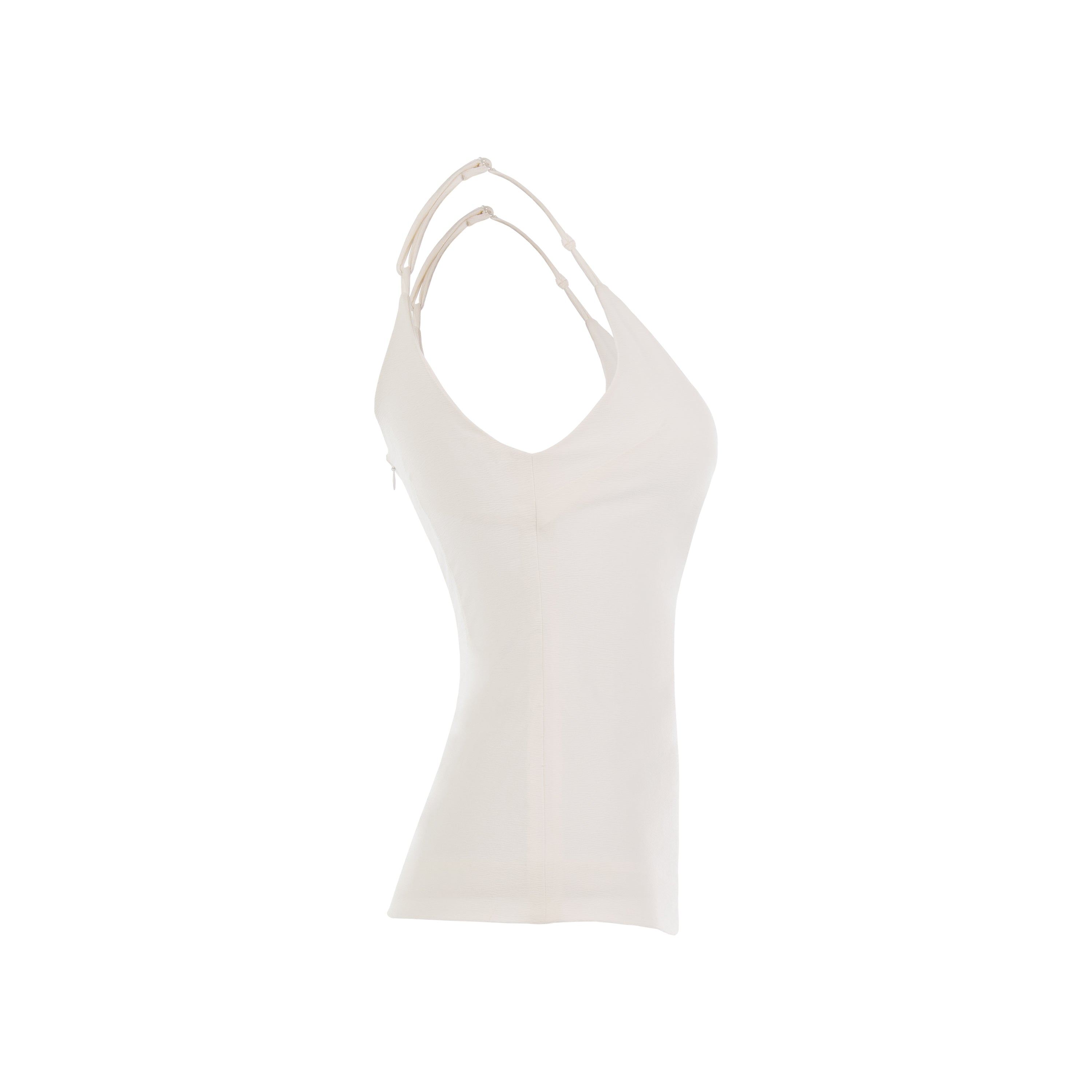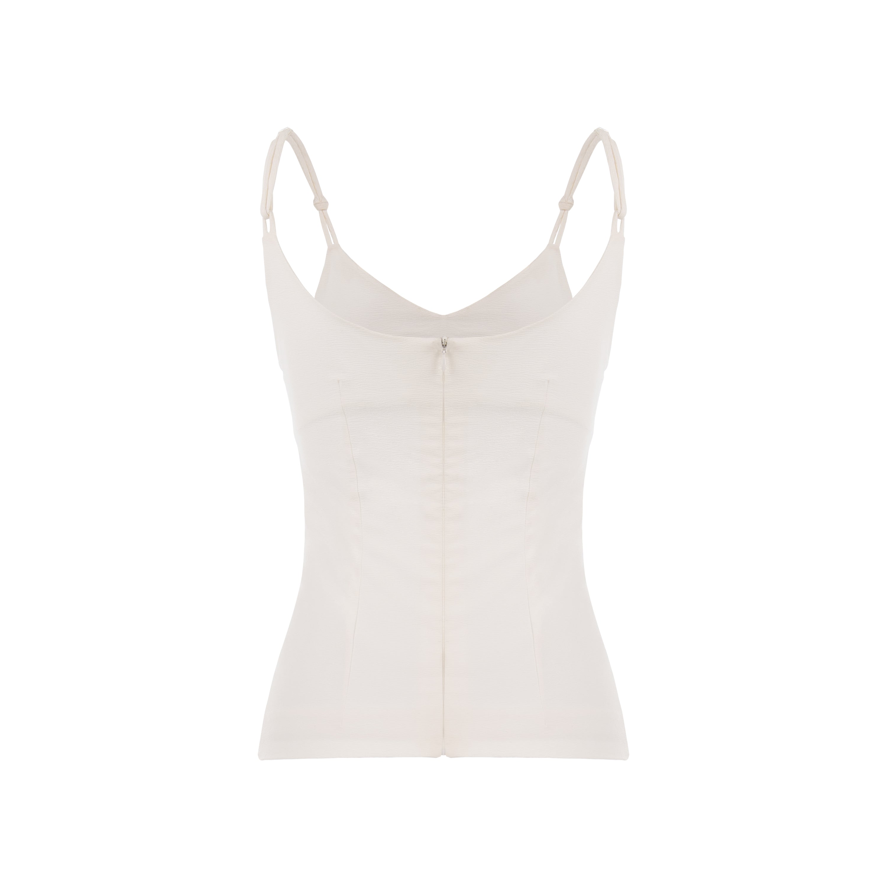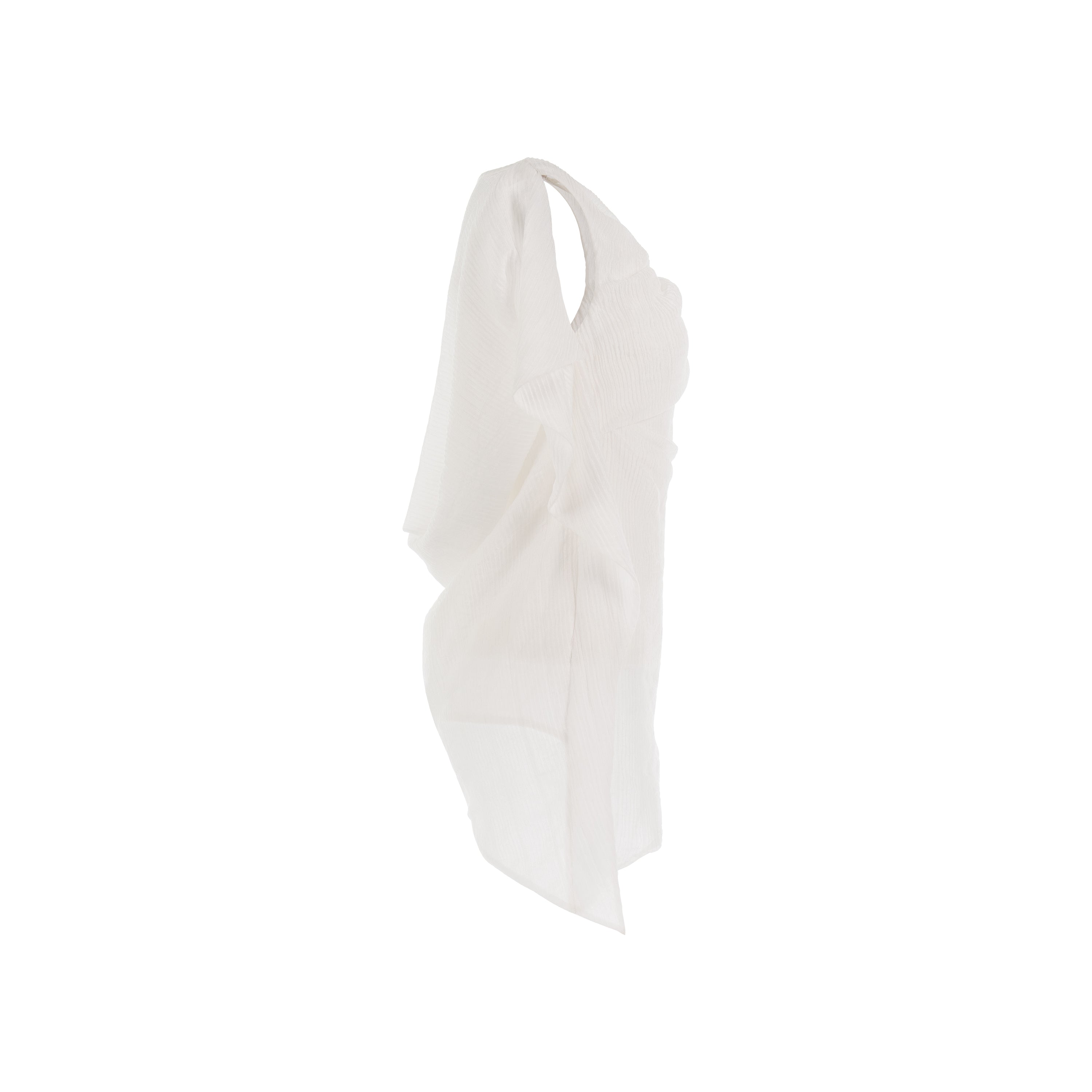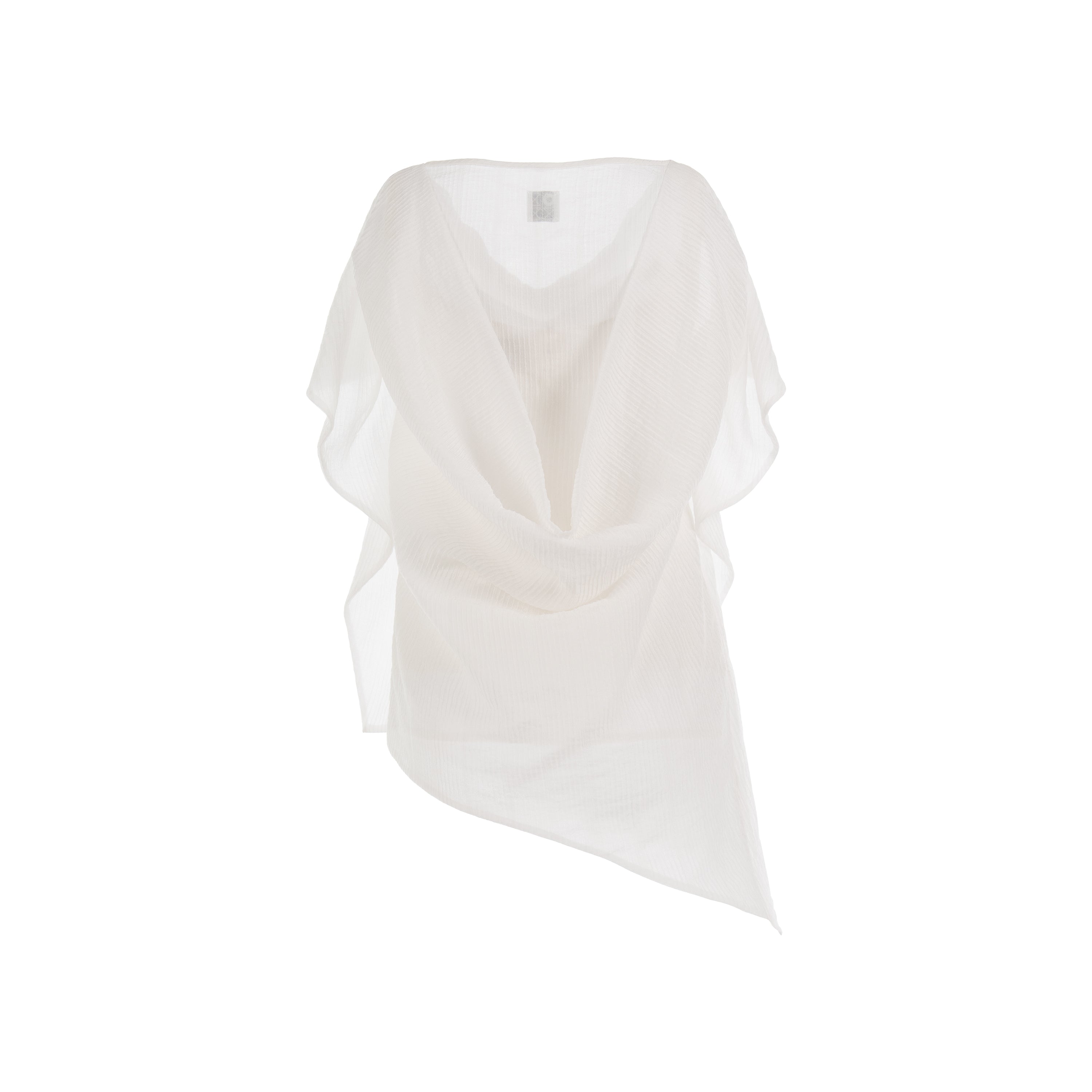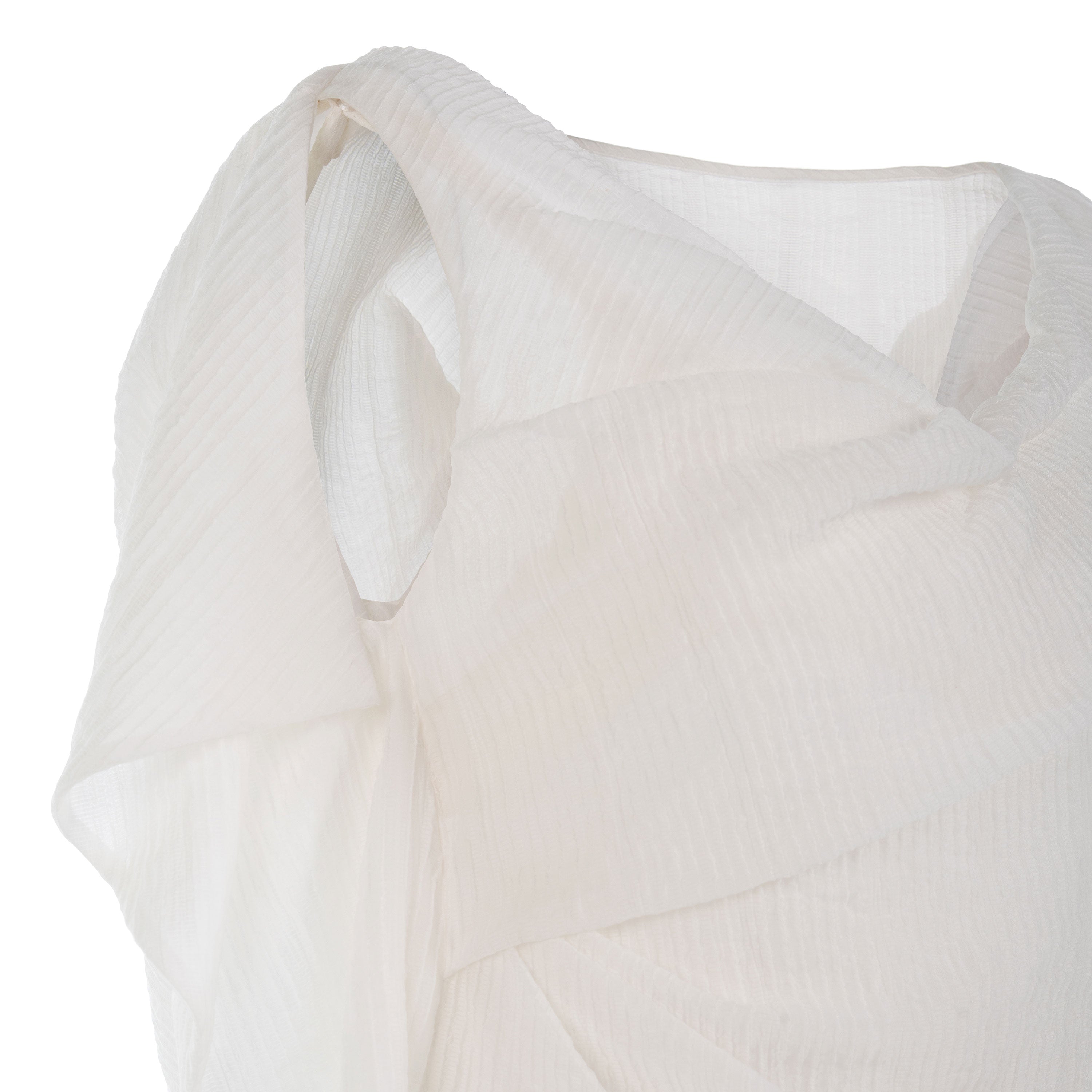 This sheer top features a twist and fold detail at the front, paired with draped detailing at the back. It is finished with an angled hemline. A matching camisole is included with this garment.