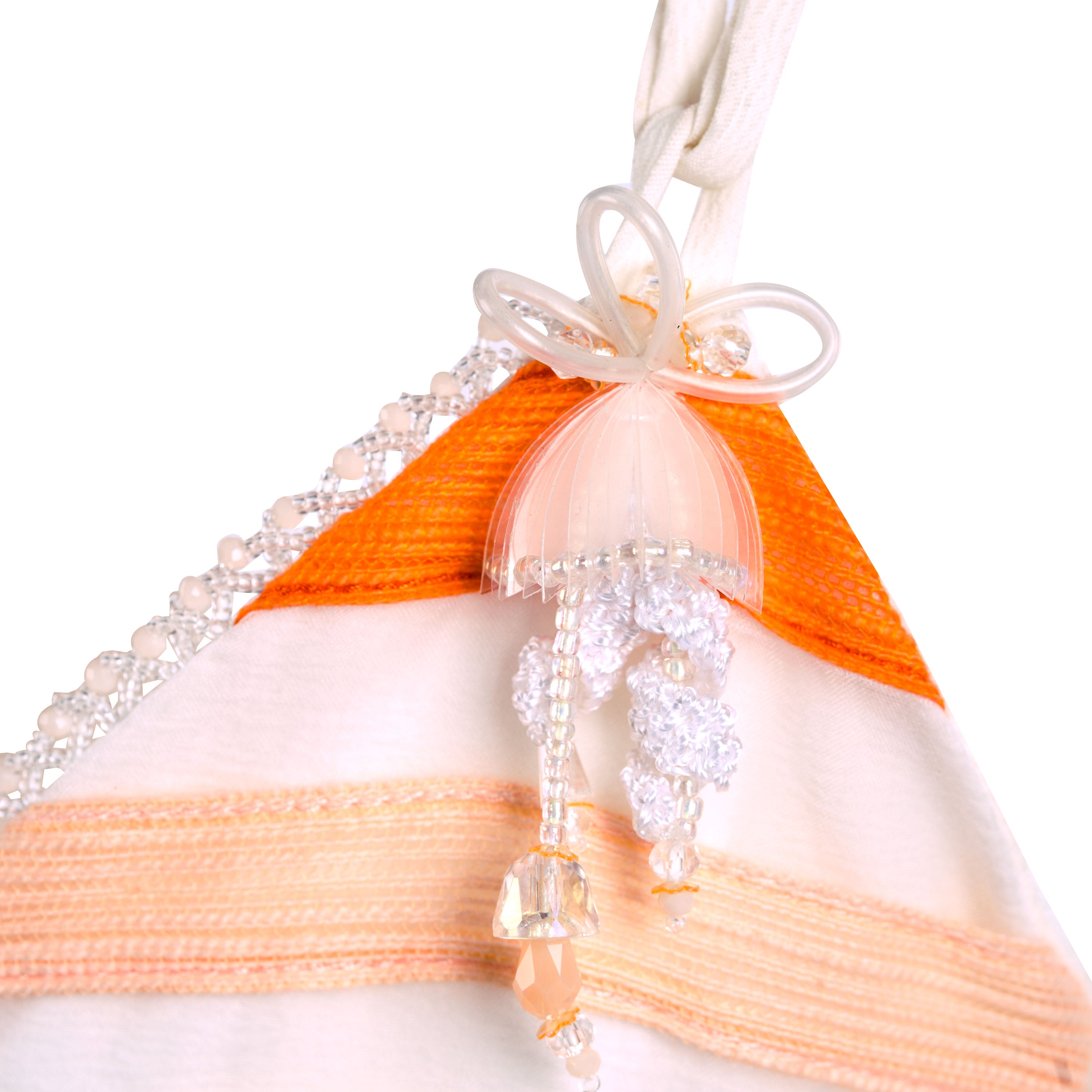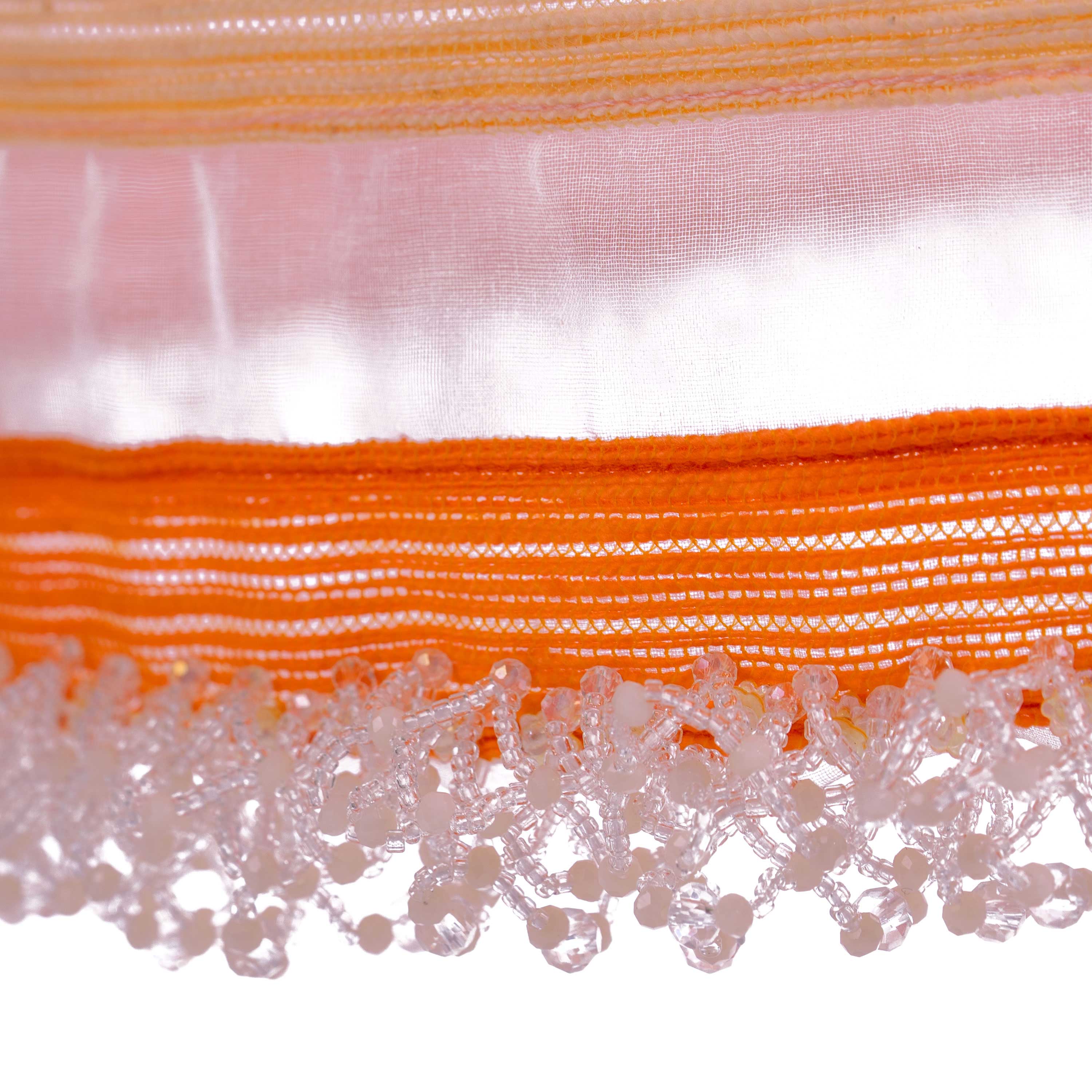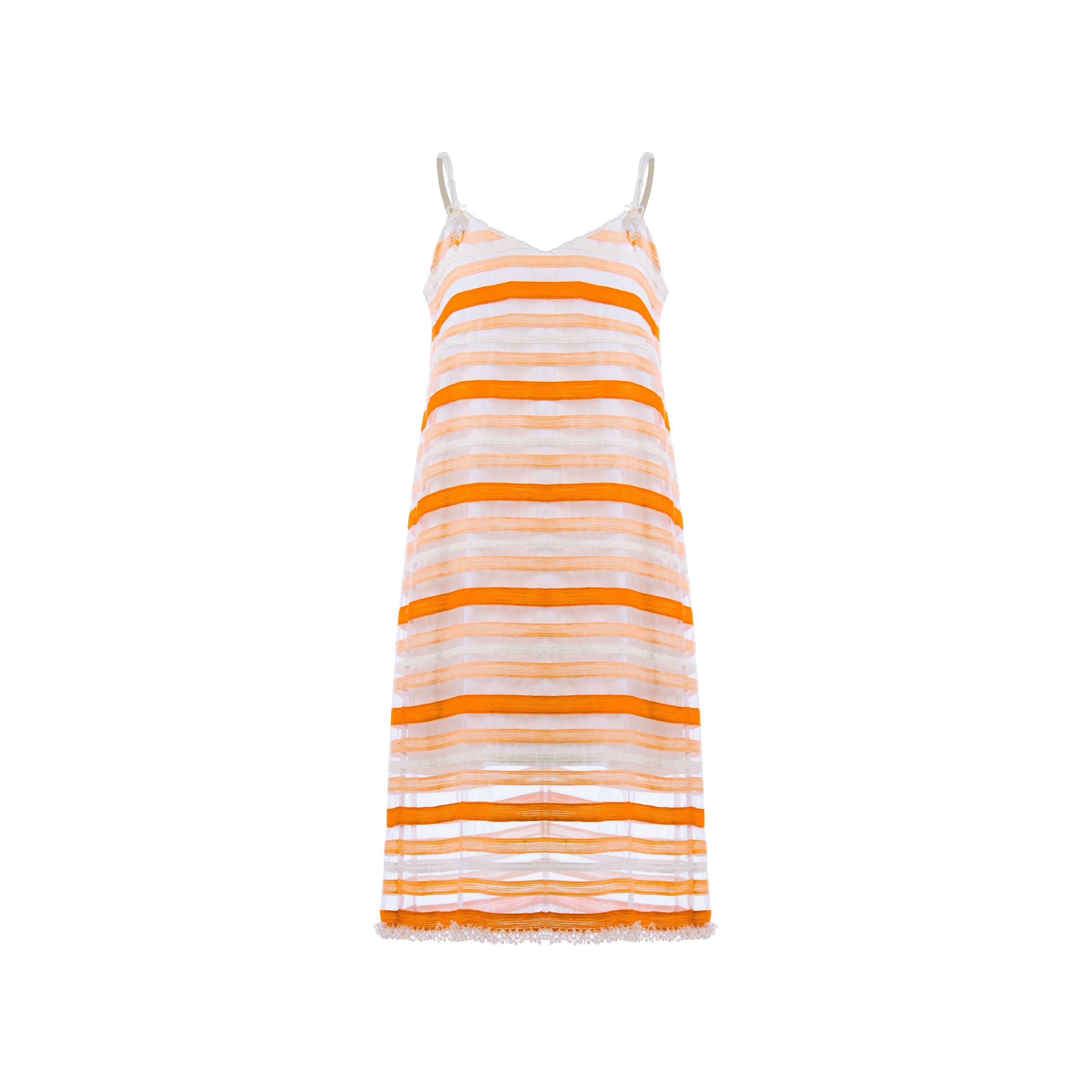 This camisol dress combines delicate spaghetti straps and a streamlined silhouette with a unique striped pattern in three hues, meticulously sewn into translucent organza fabric. It is adorned with 3D embellished flowers at the top hem, while layered sequins cascade along the lower edge of the fabric, adding depth and texture to the overall design.