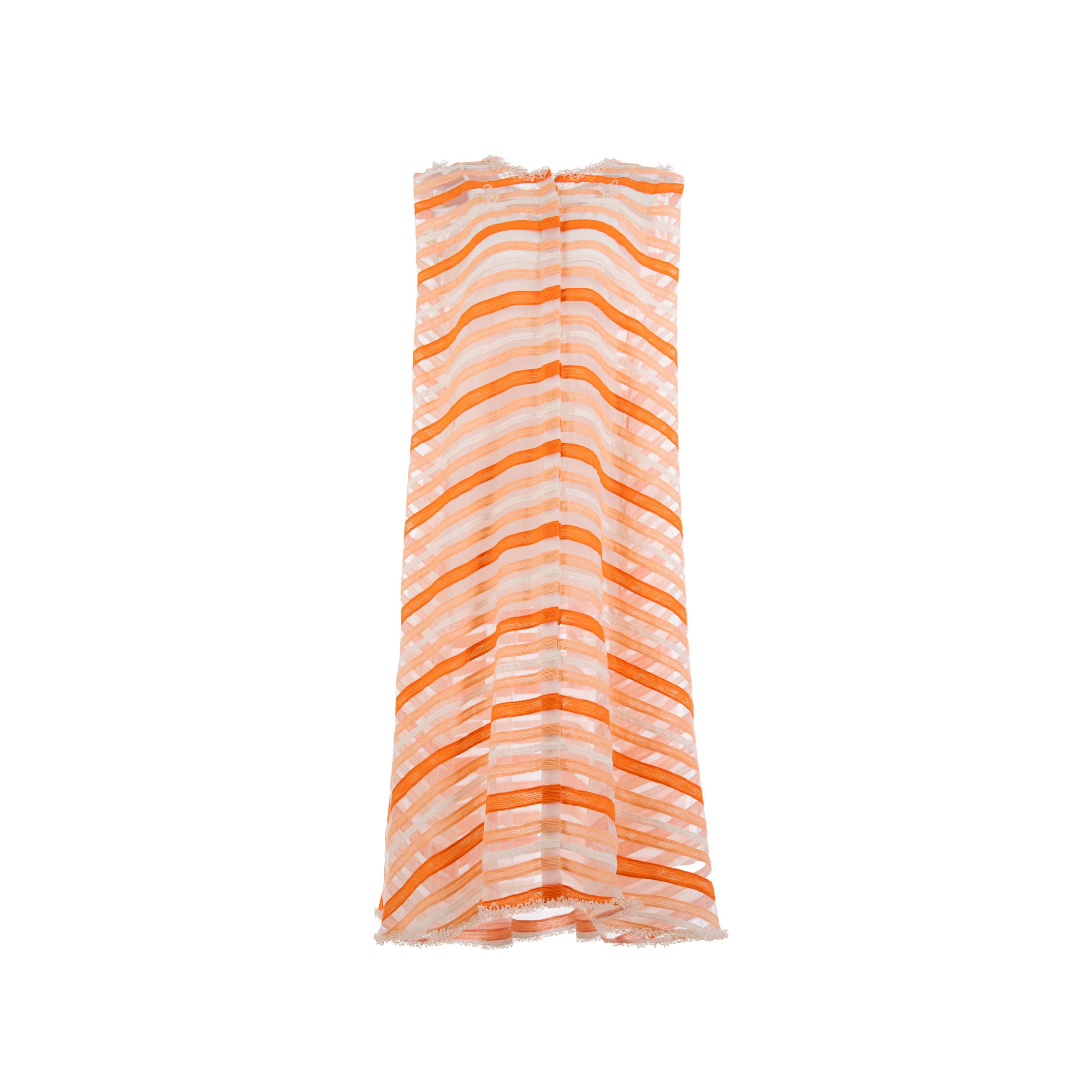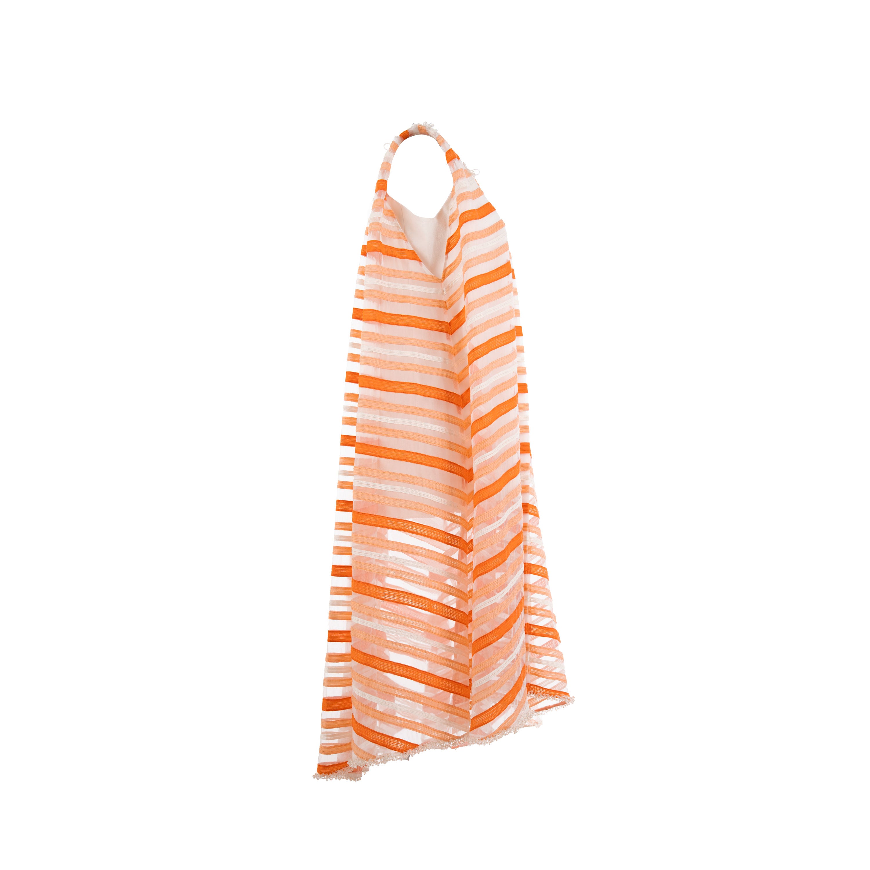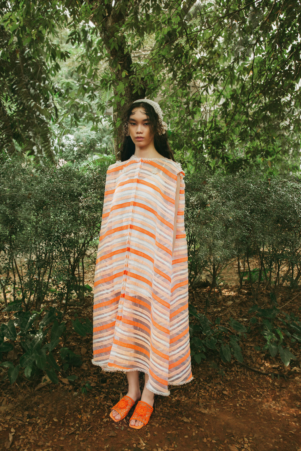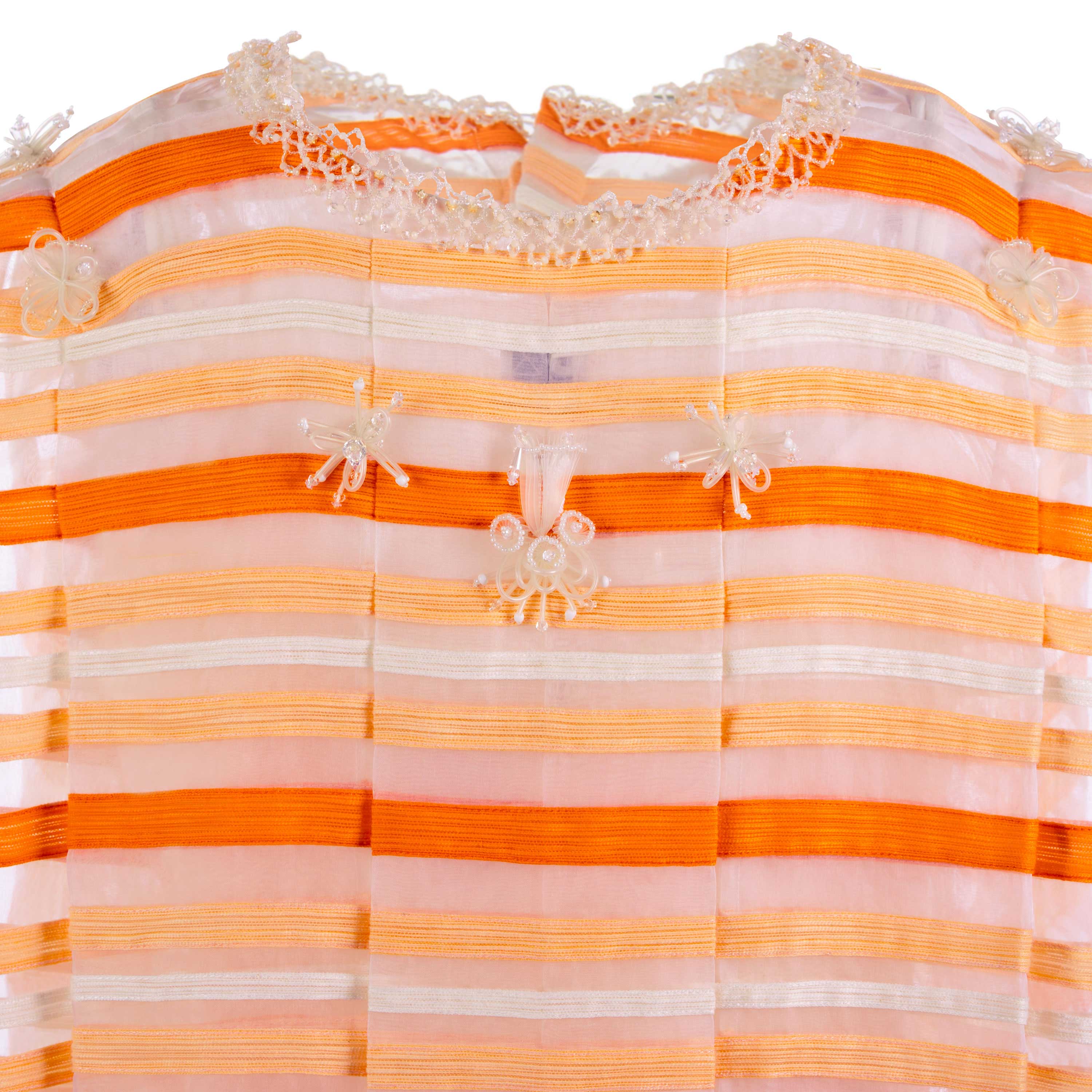 This coat features a boxy silhouette with a striped pattern in three hues meticulously sewn into translucent organza fabric. It has oversized shoulders and embellishments of beaded fringes on the collar and hemline, as well as 3D embellishments on the chest and back. A matching camisole is included with this garment.