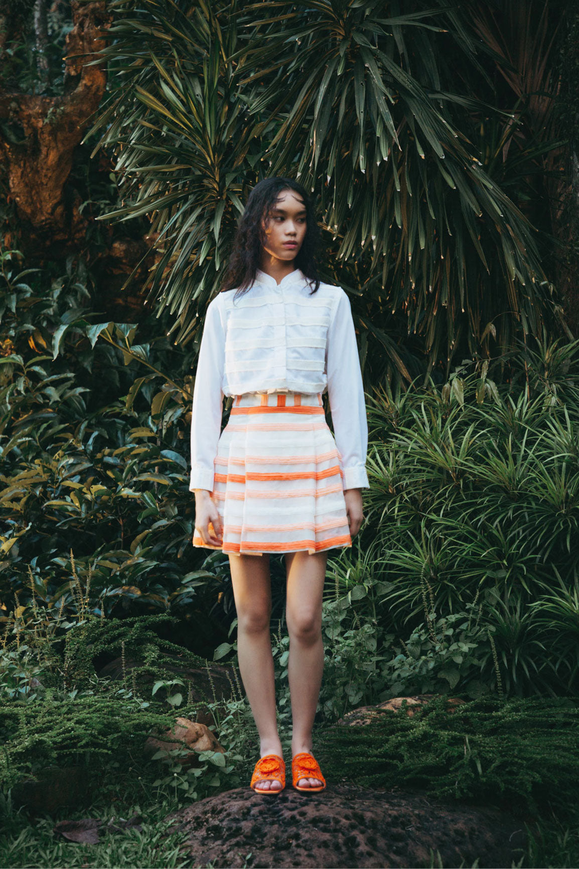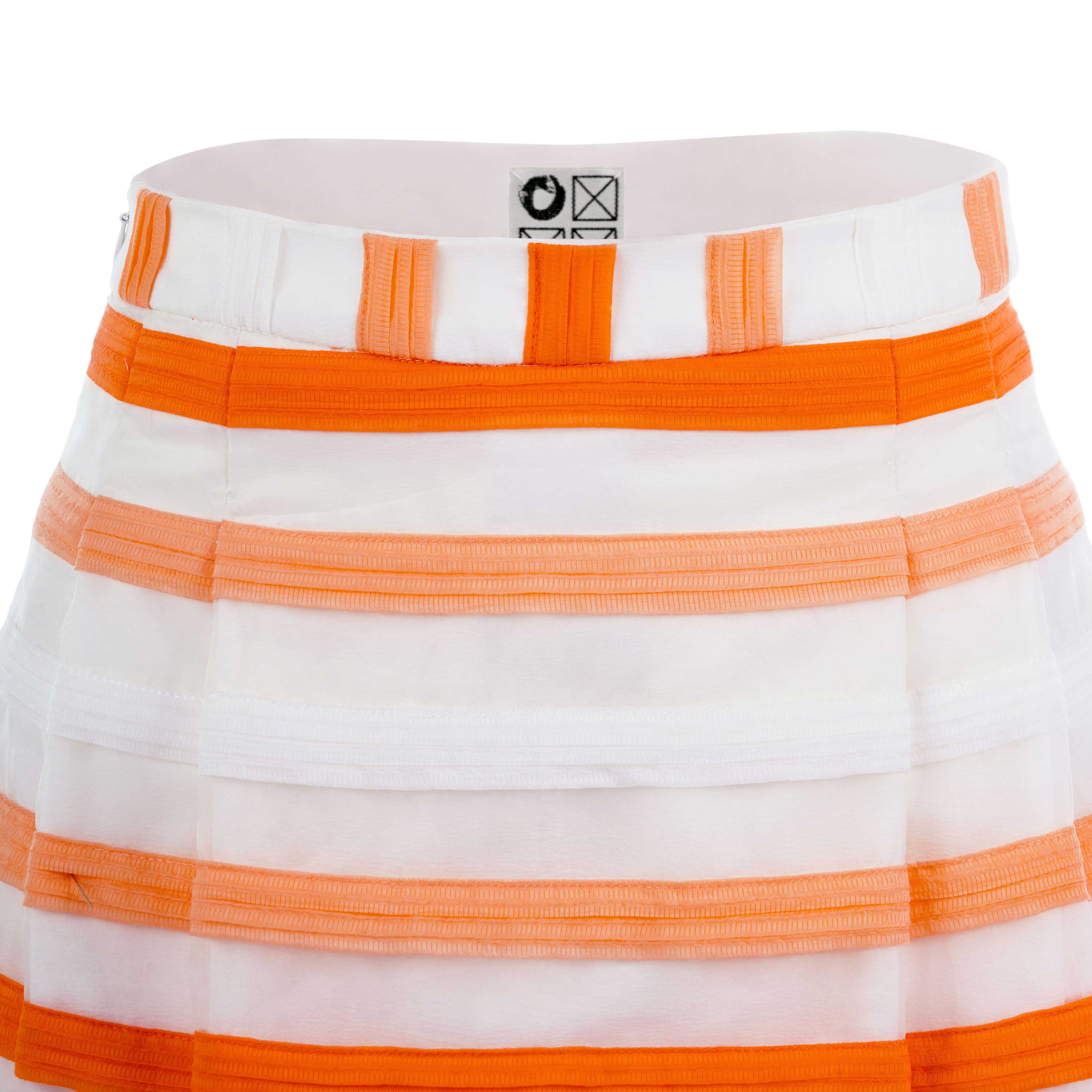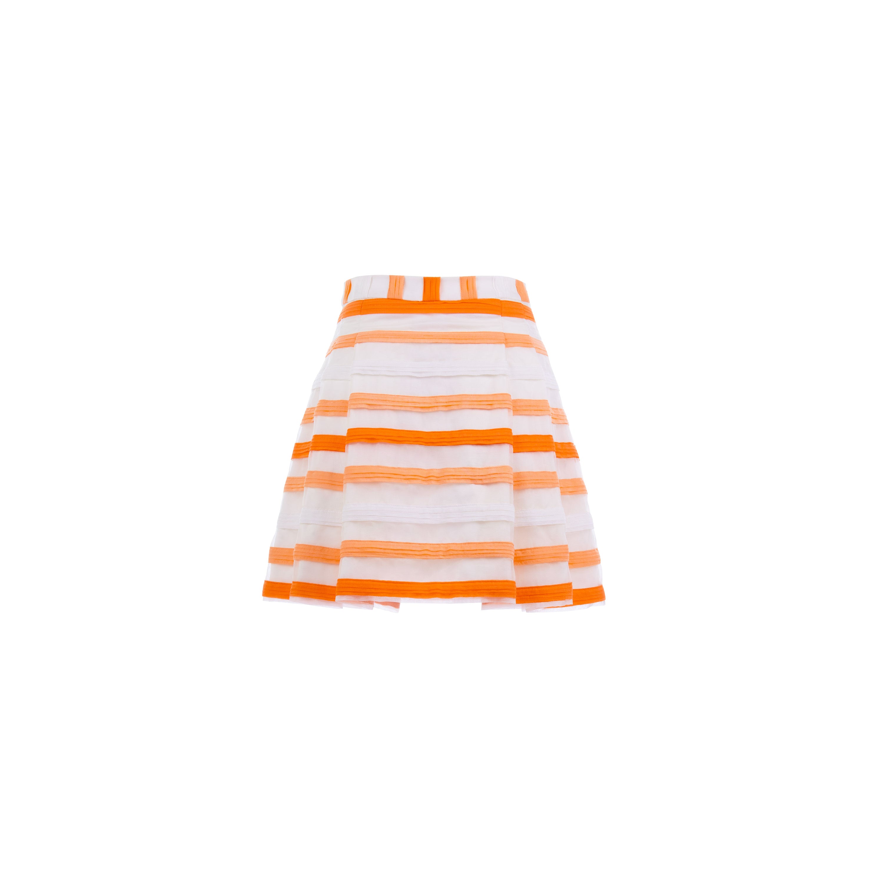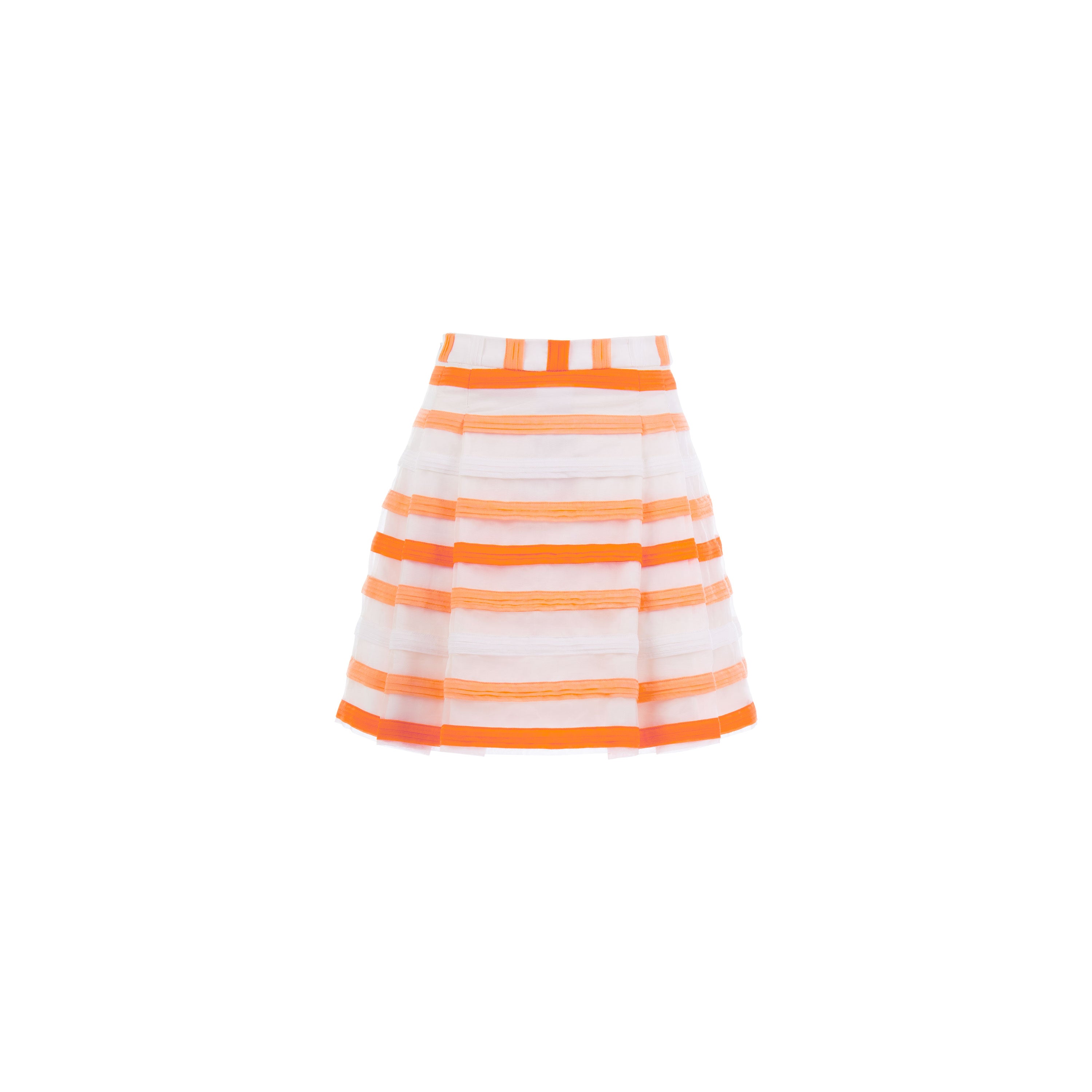 This skirt showcases an opnaisel pleats striped in three hues meticulously sewn into translucent organza fabric, featuring double pleats that are deep at the front and back. It has a hidden zipper closure at the back