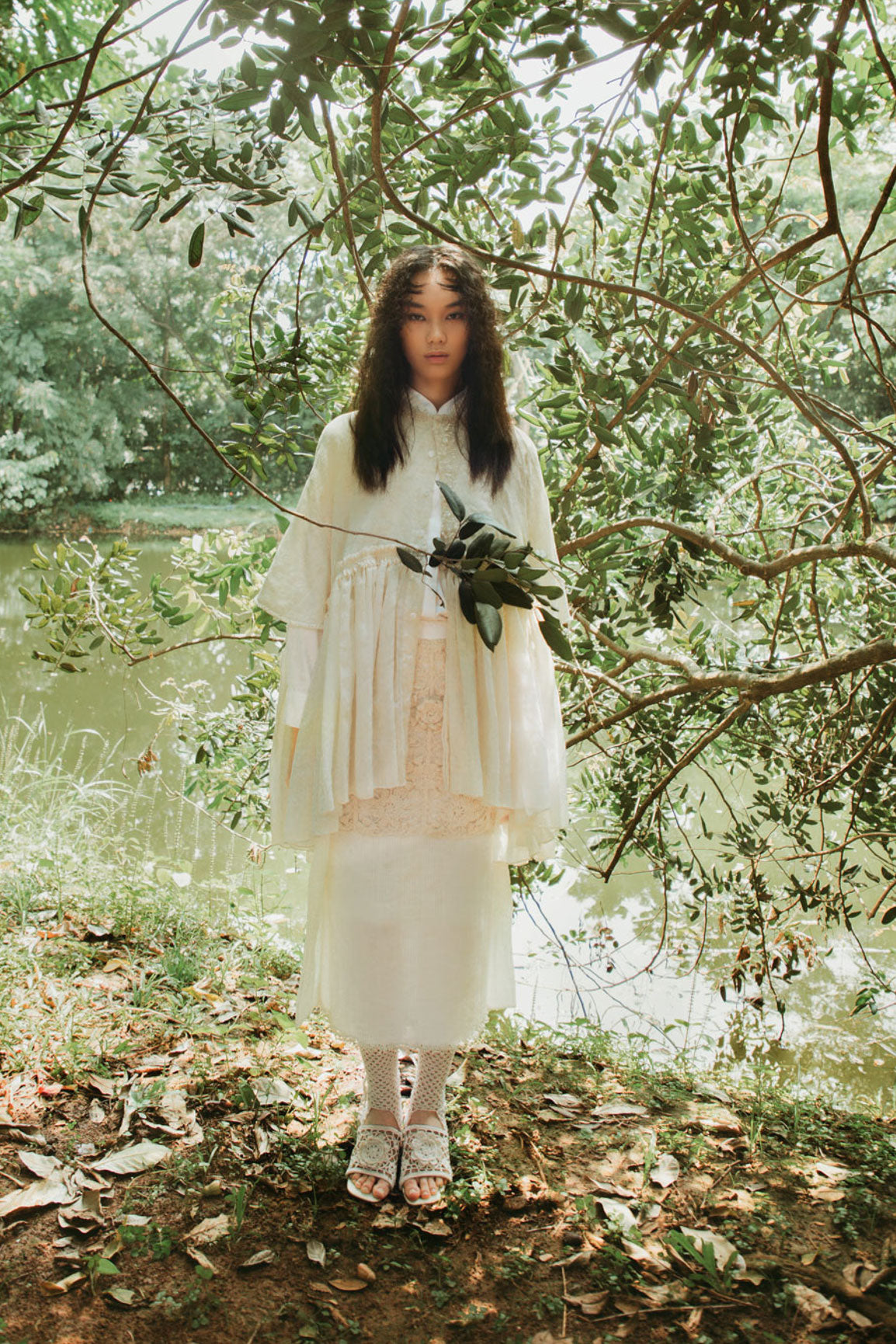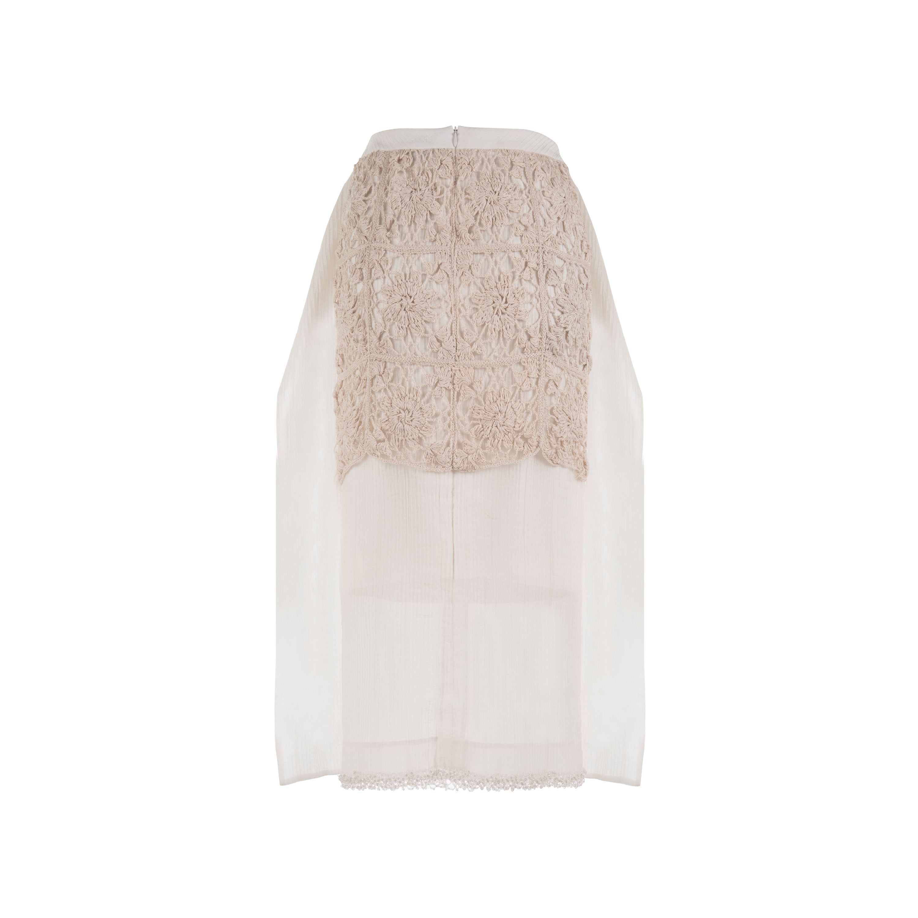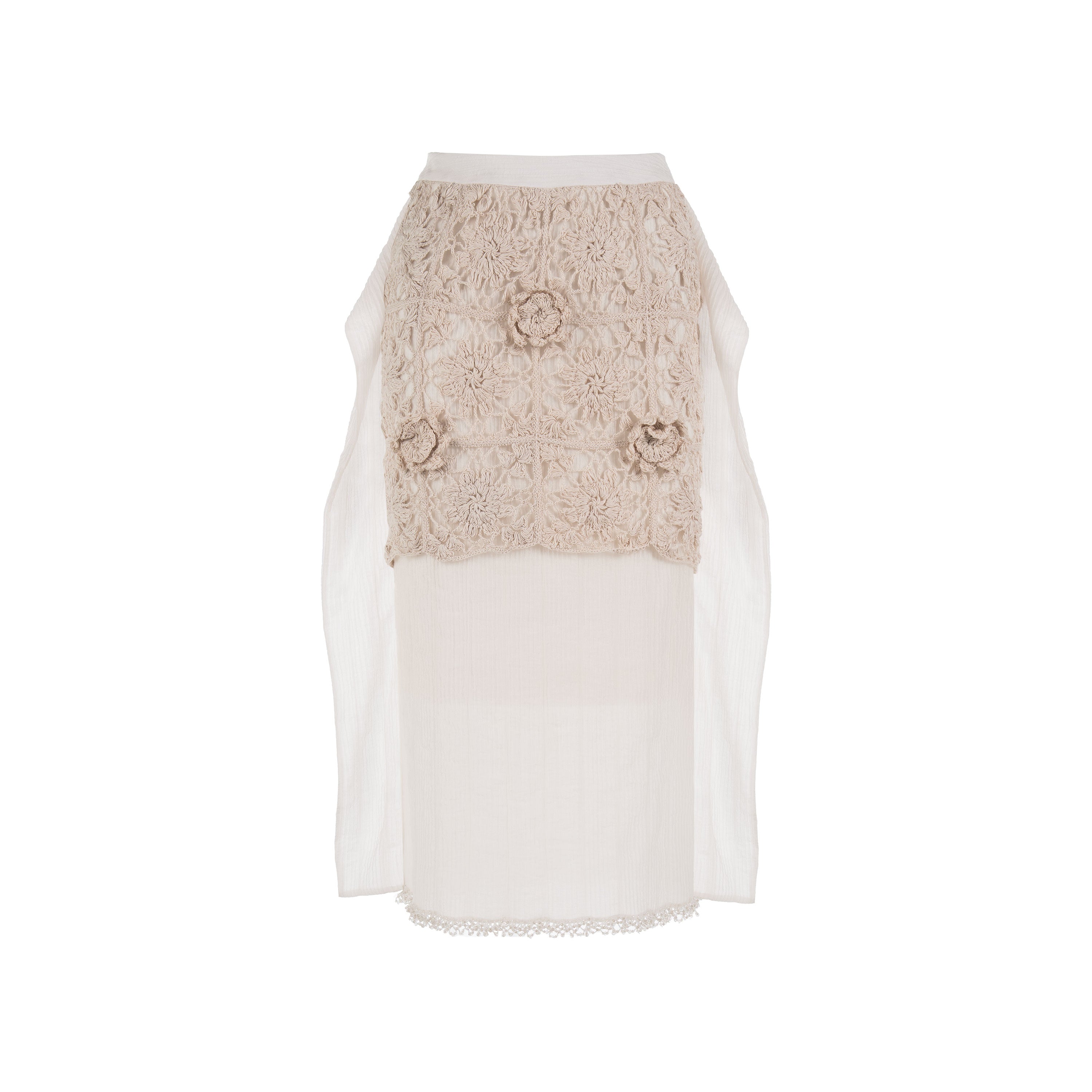 A straight skirt adorned with handmade grandma crochet on the upper portion, flap details on both sides, and embellished with beaded fringes along the hemline.