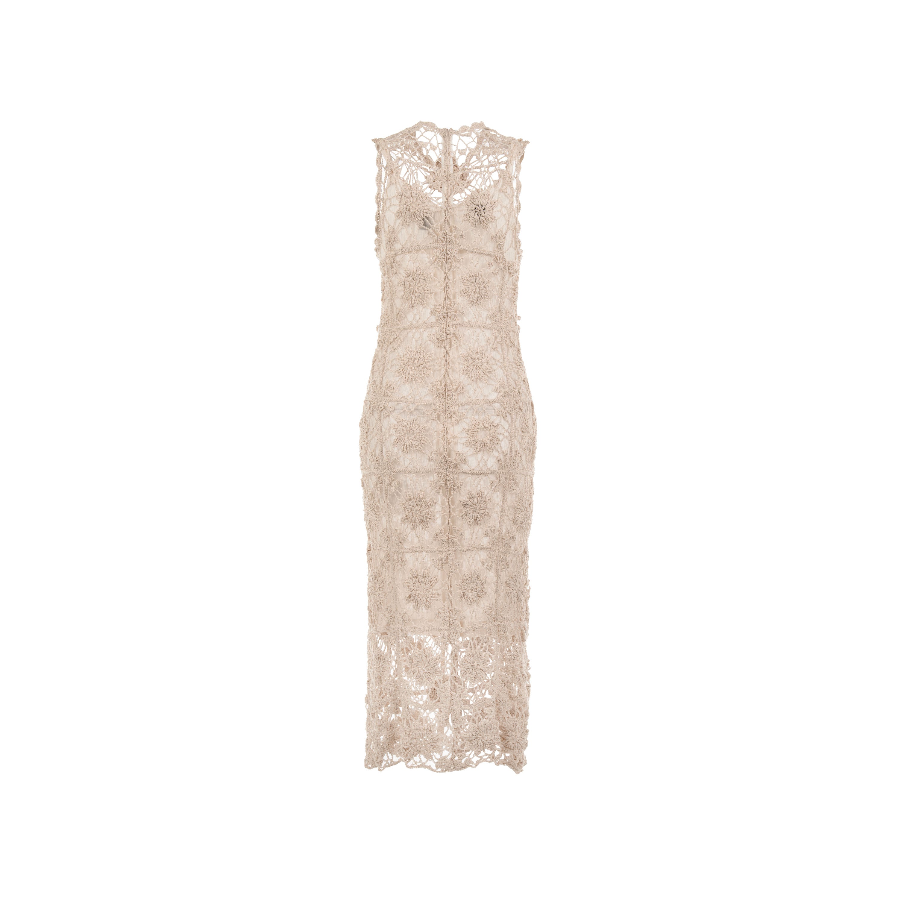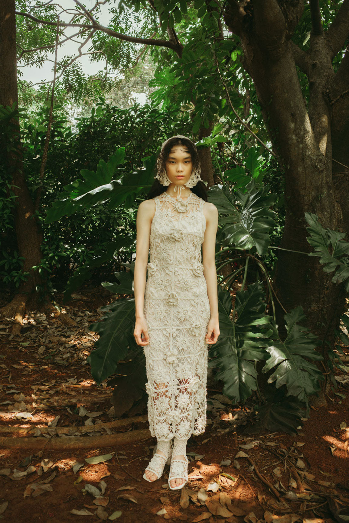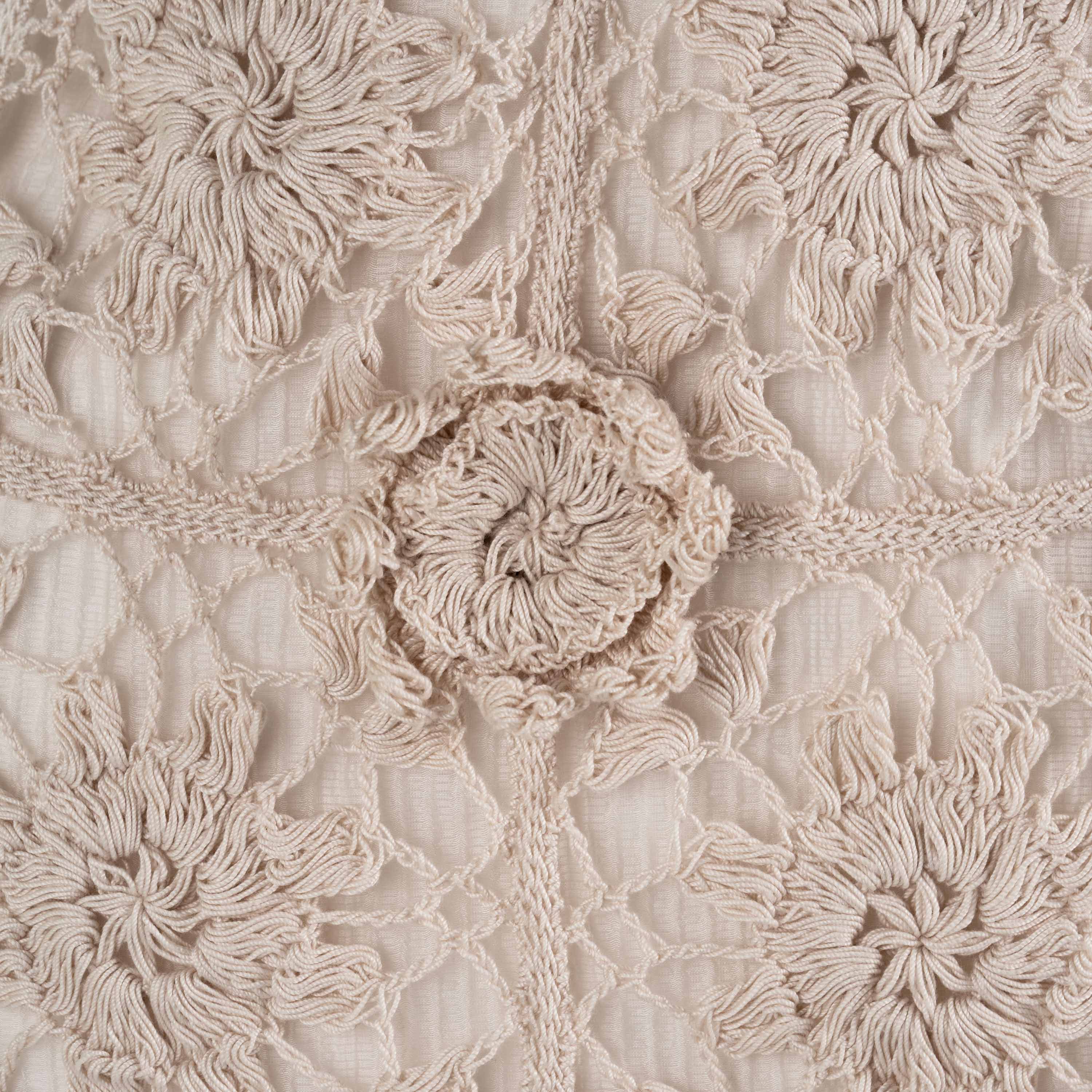 This dress is 7/8 length and features full handmade grandma crochet flowers, including 3D flower crochet detailing at the front. It has a hidden zipper closure at the back. A matching camisole is included with this garment.