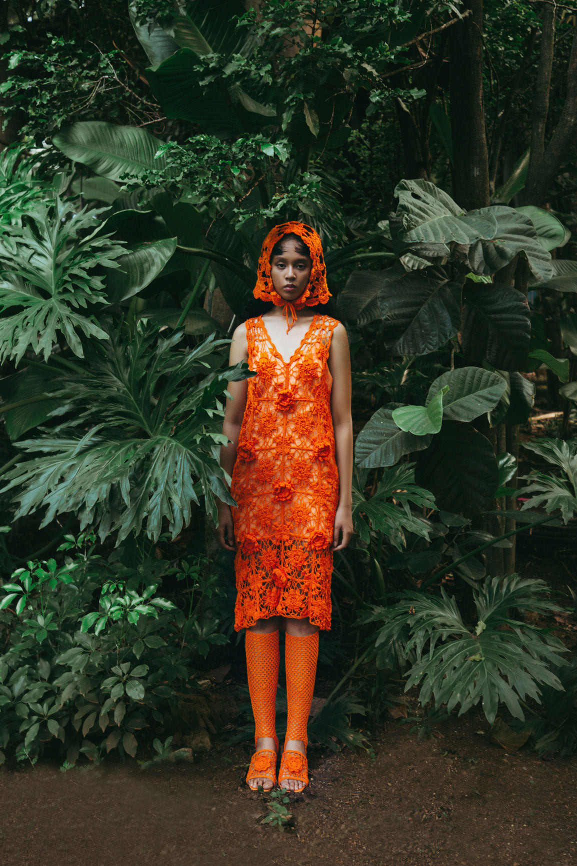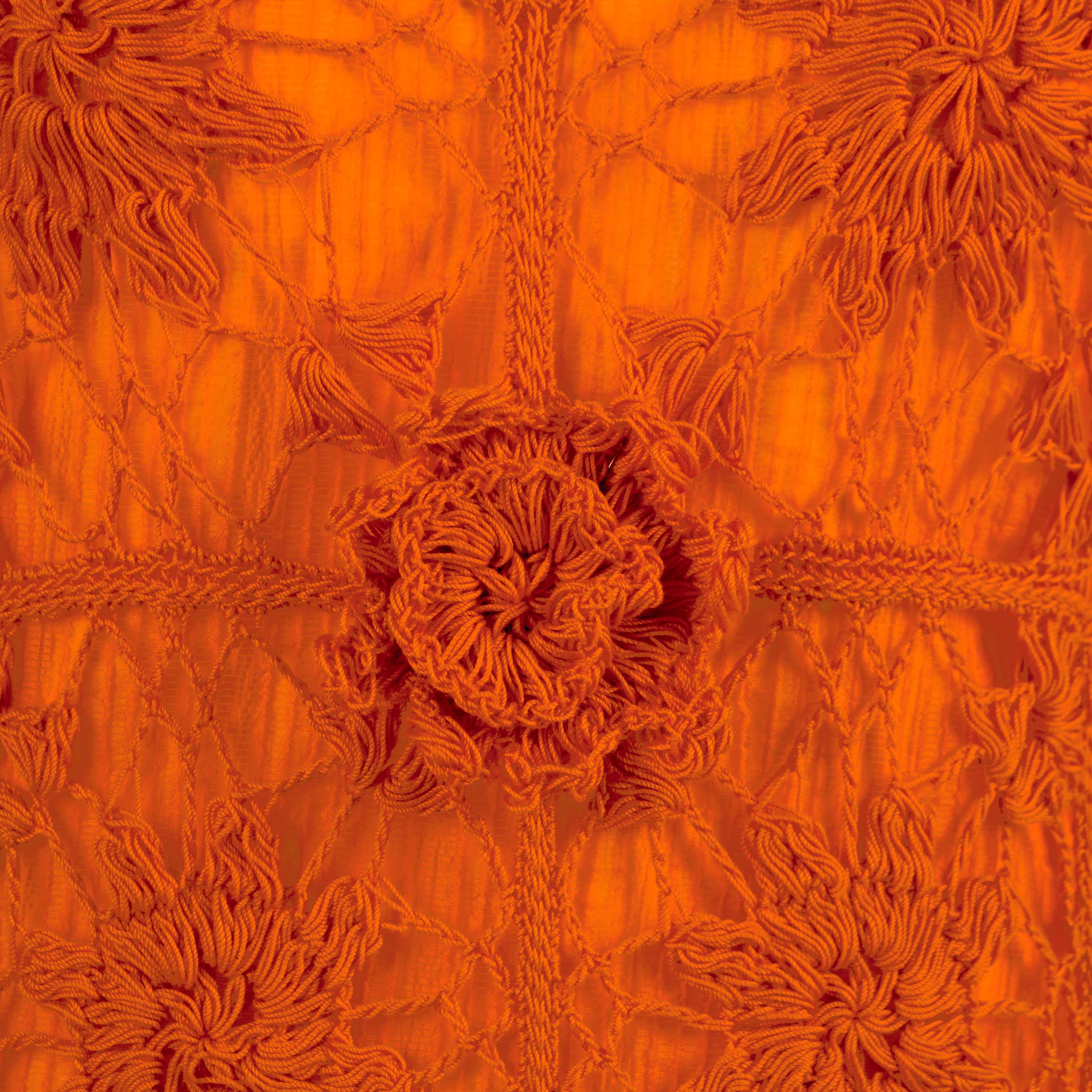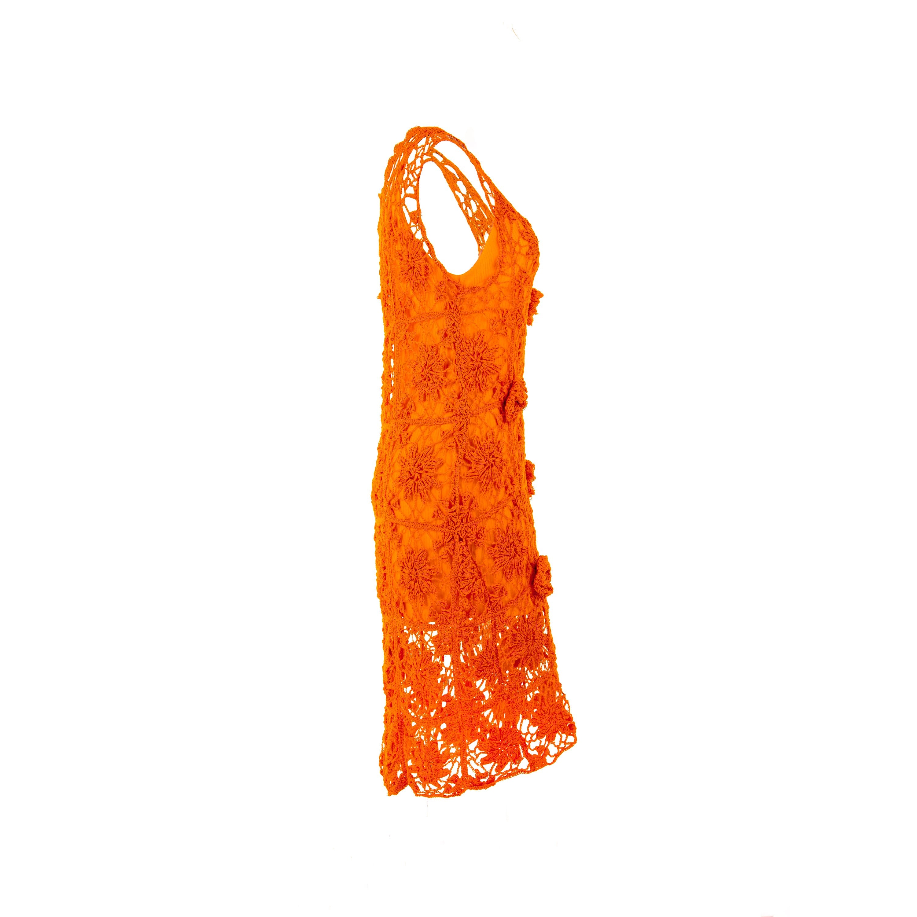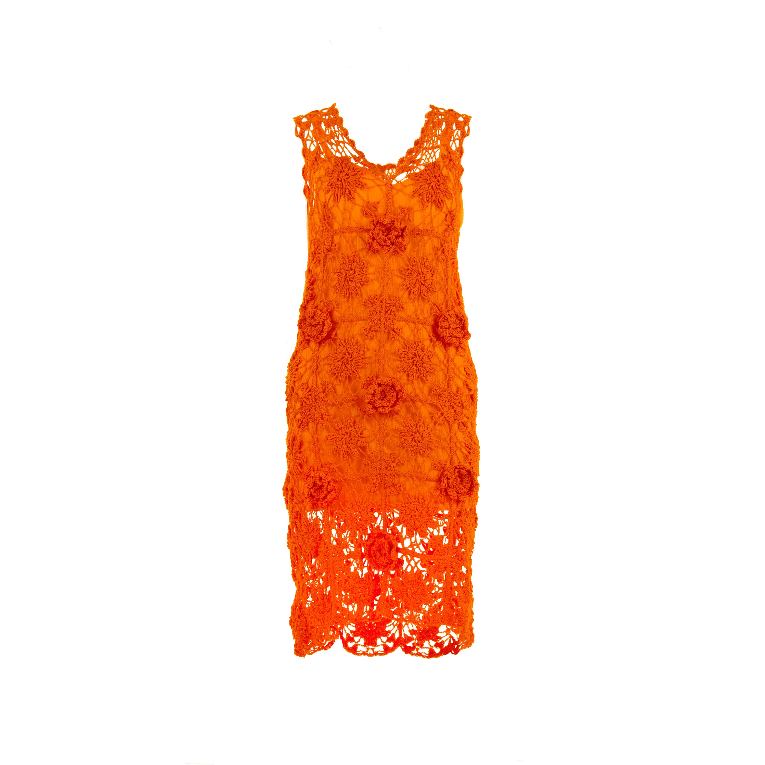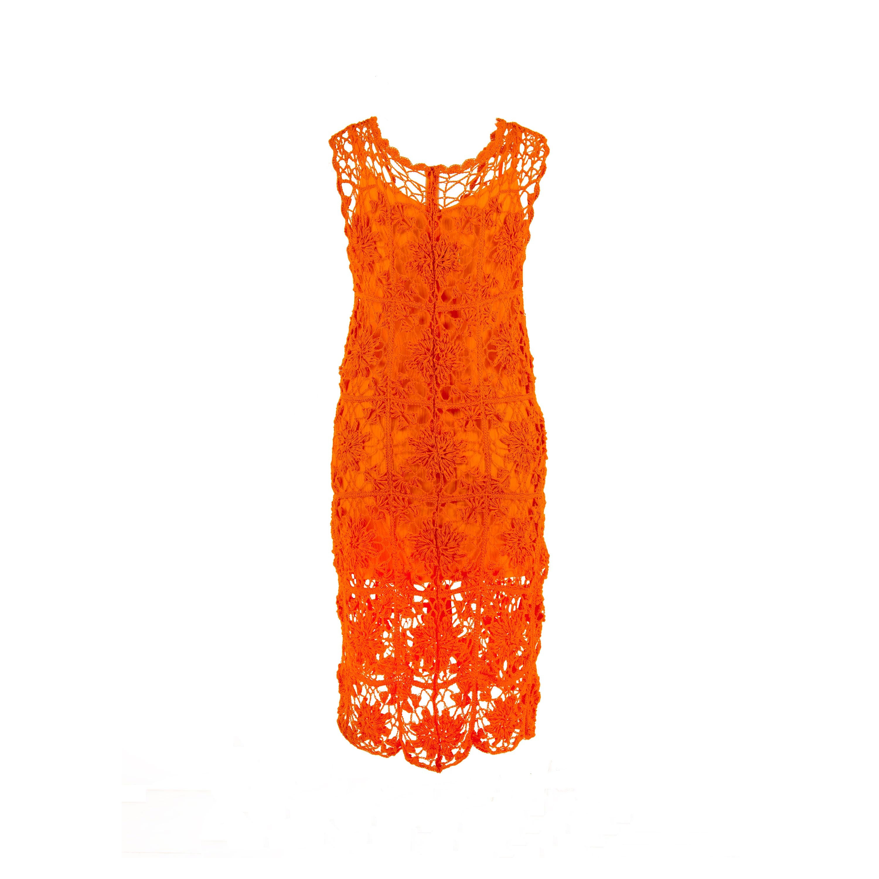This dress is knee-length with V-cut neckline and features full handmade grandma crochet