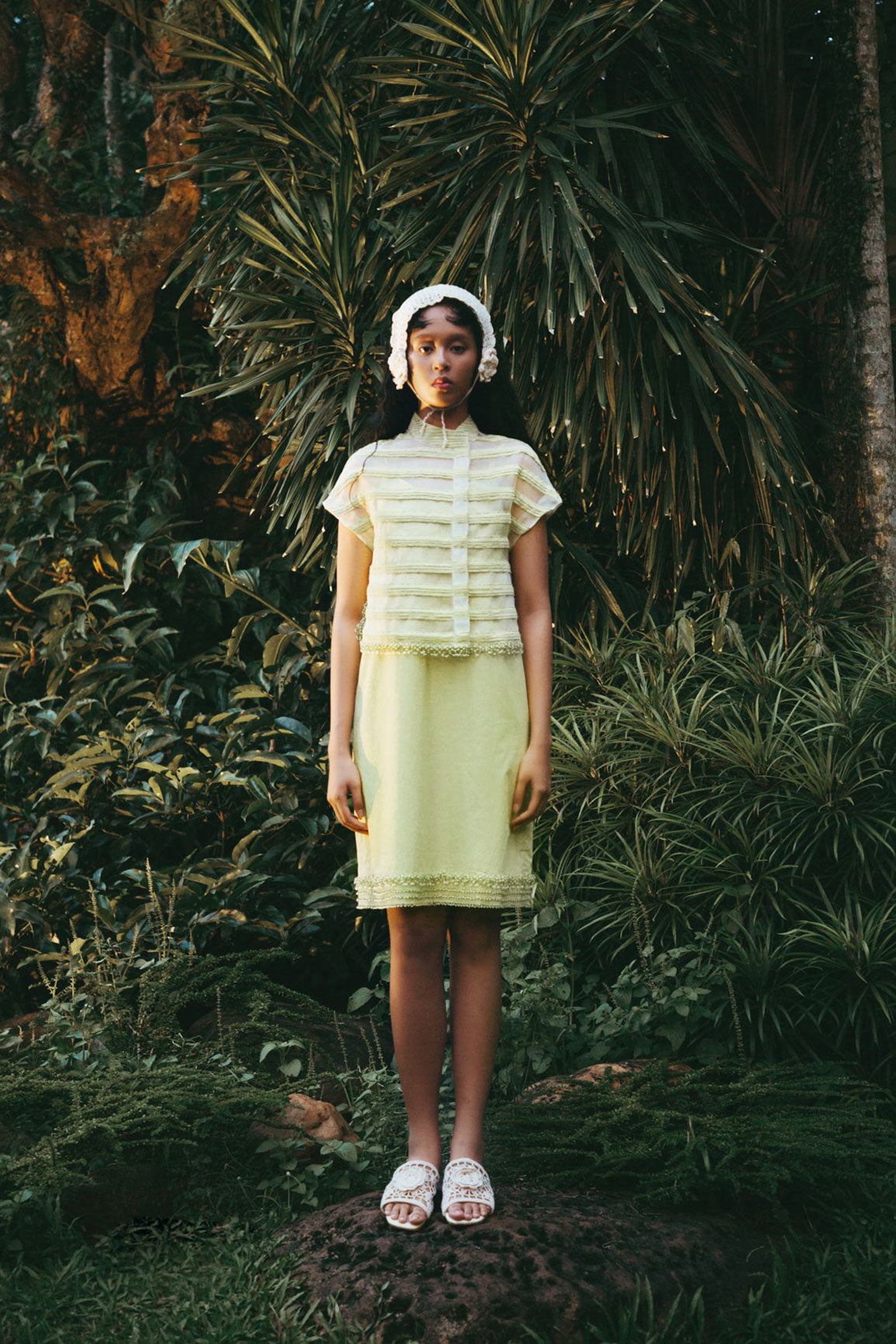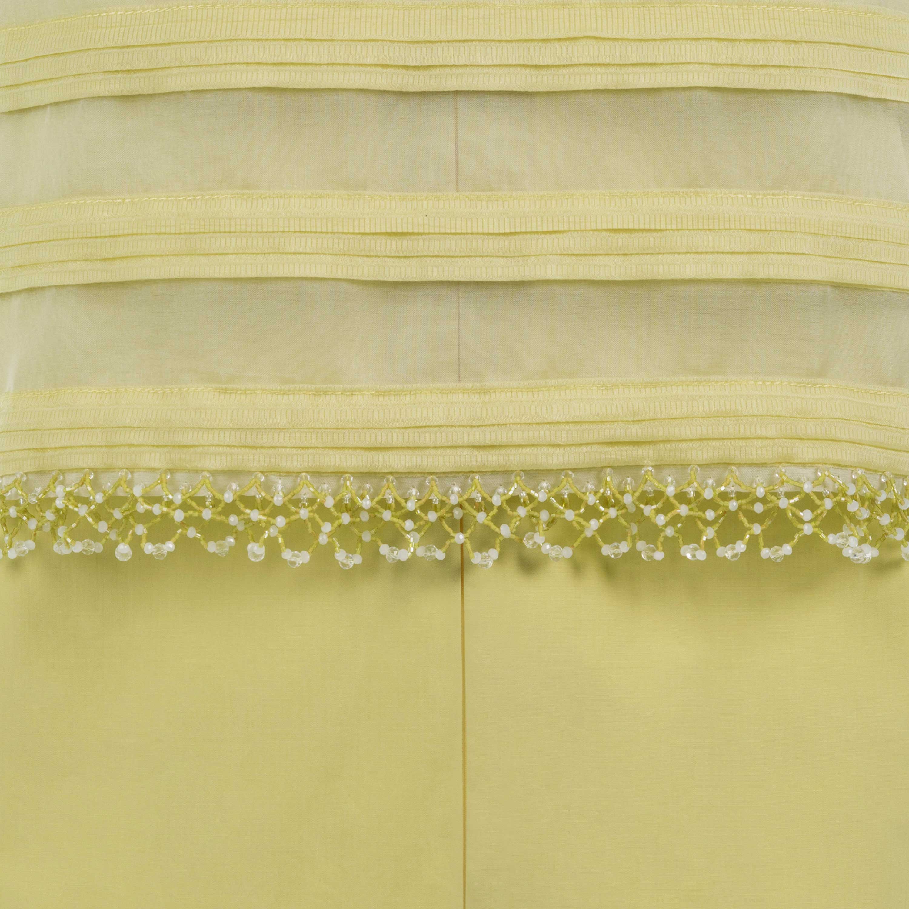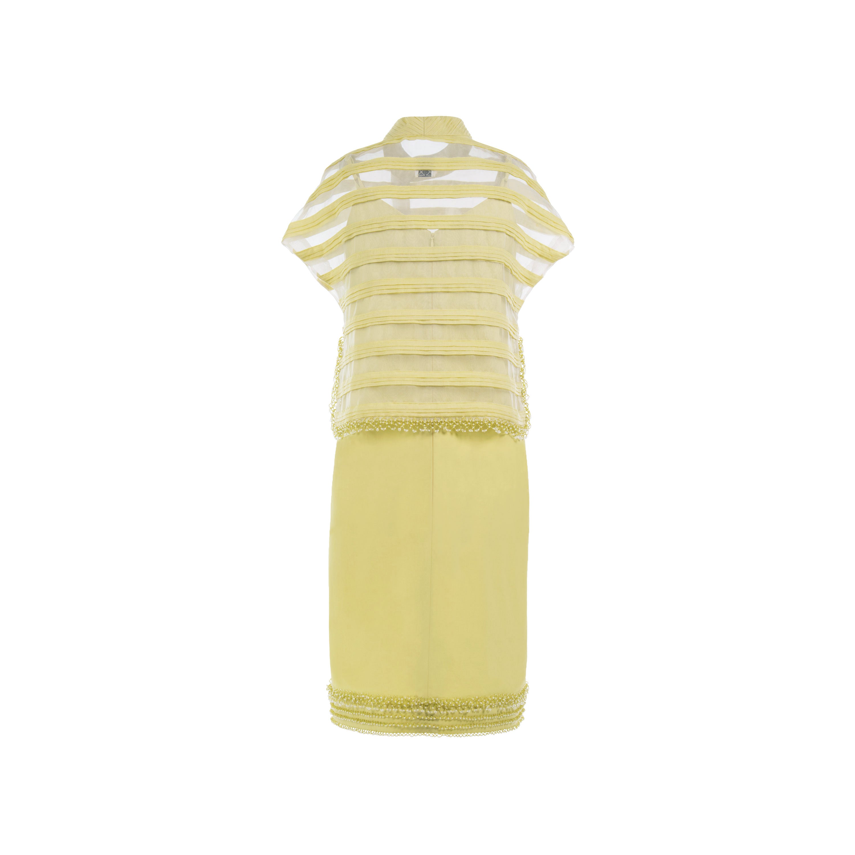 This two-piece dress features opnaisel stripe pleatsin lime color, meticulously sewn into translucent organza fabric for the outer layer. It includes a mock neck with asymmetrical hidden front buttons and beaded fringes on the hemline. The inner liner is a straight volume camisole with knee length and beaded fringes along the hemline.