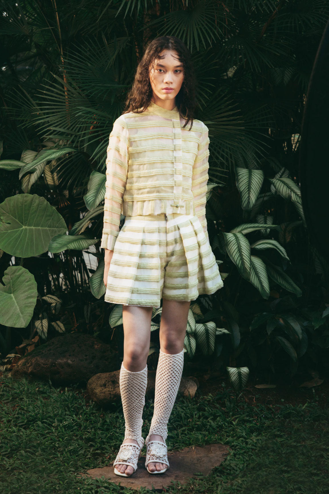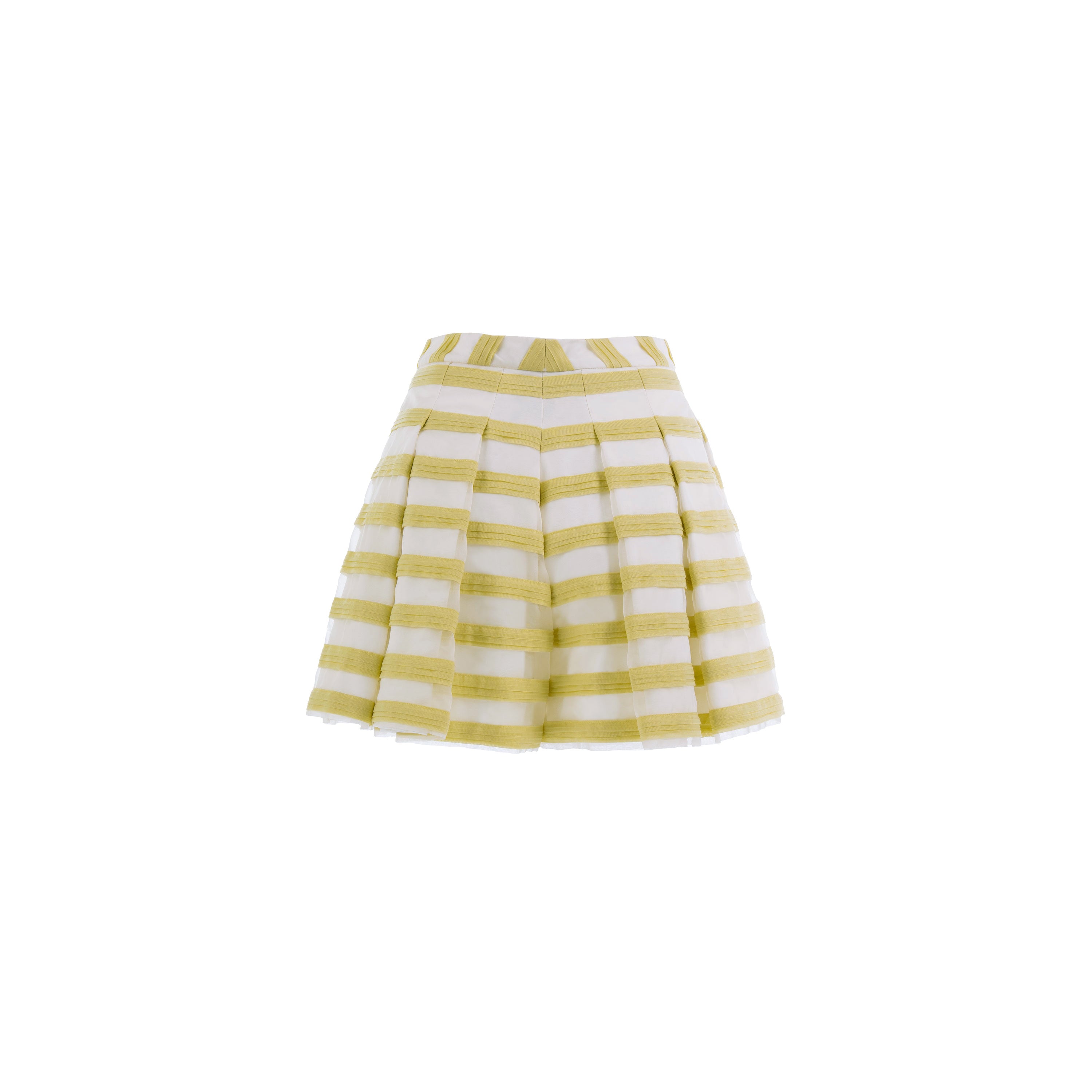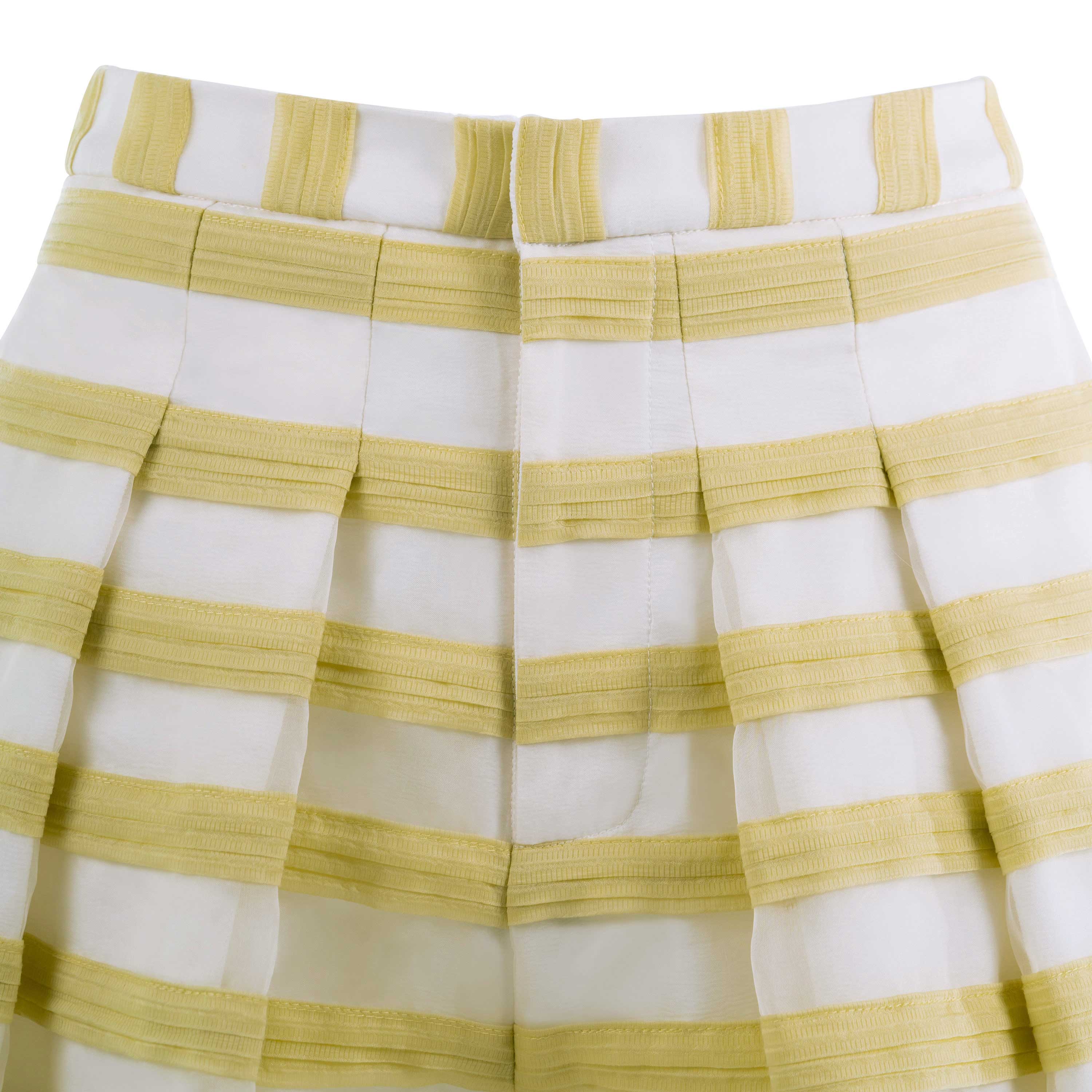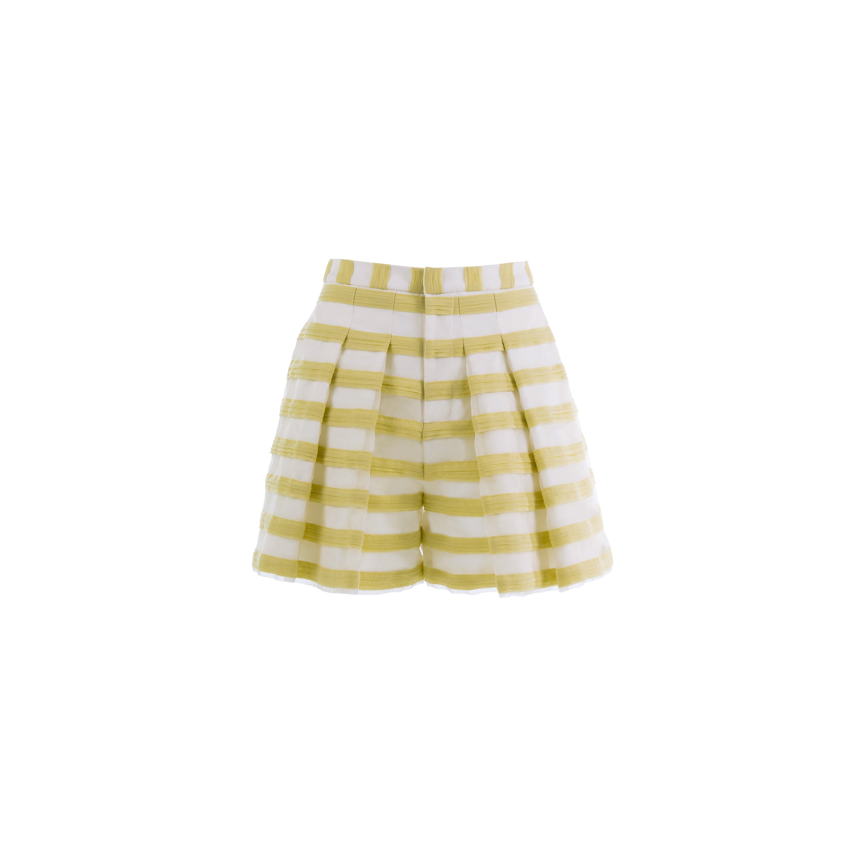 These shorts showcase opnaisel stripe pleats in a lime color, meticulously sewn into translucent organza fabric. They feature deep folded pleats to add volume.