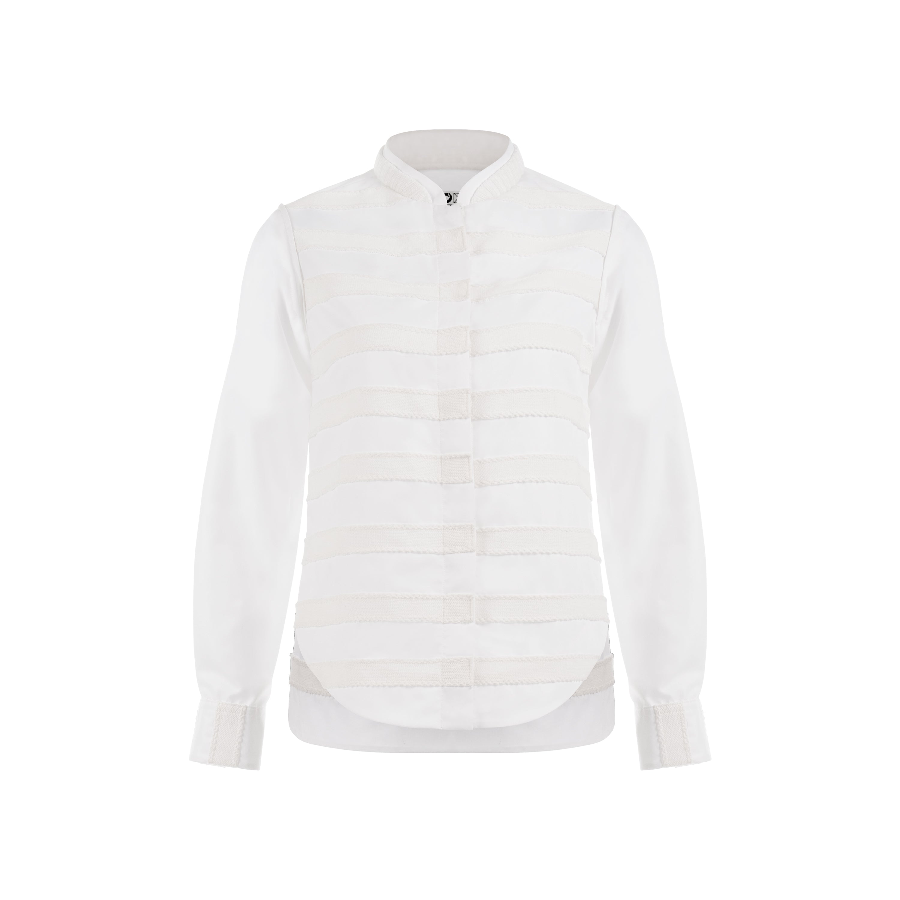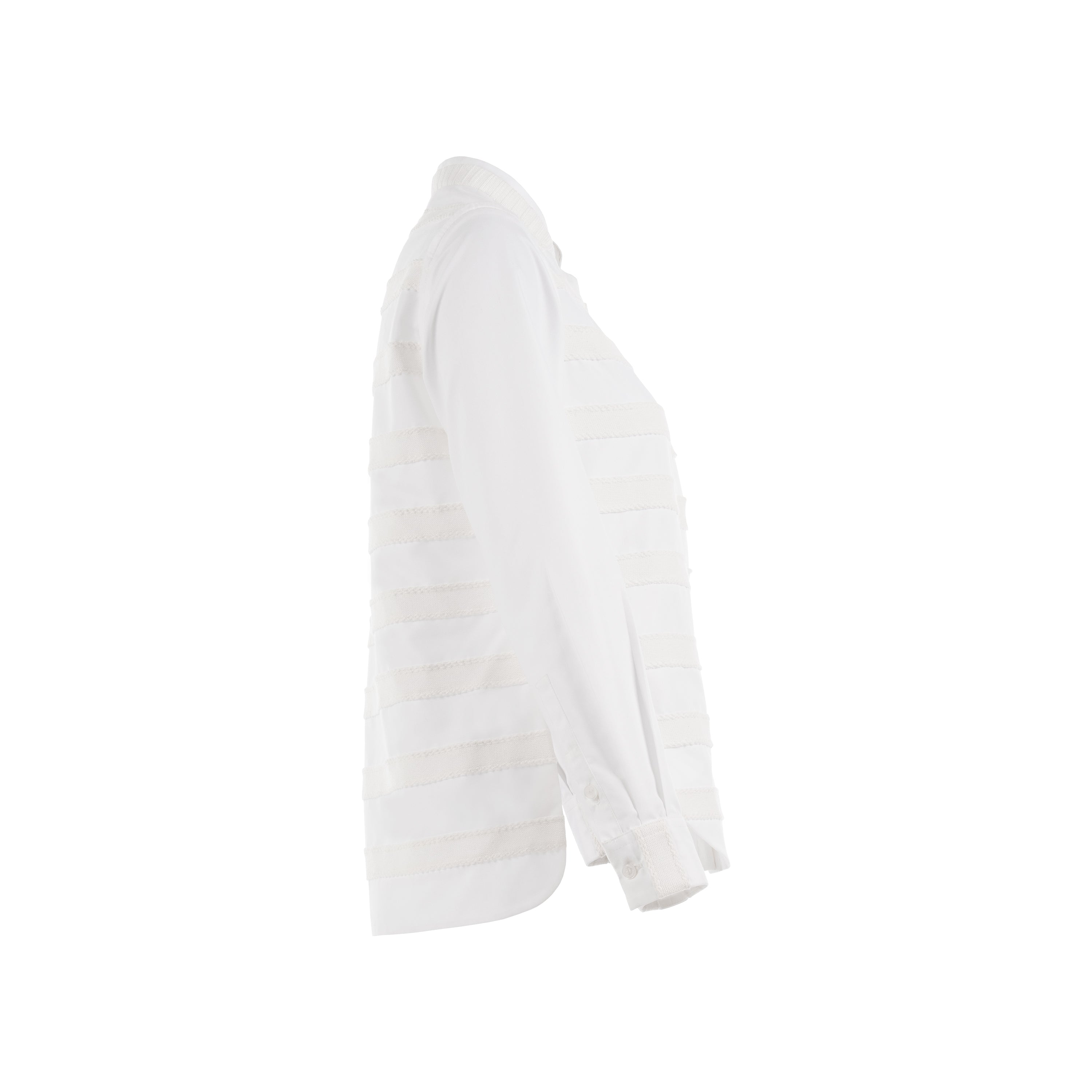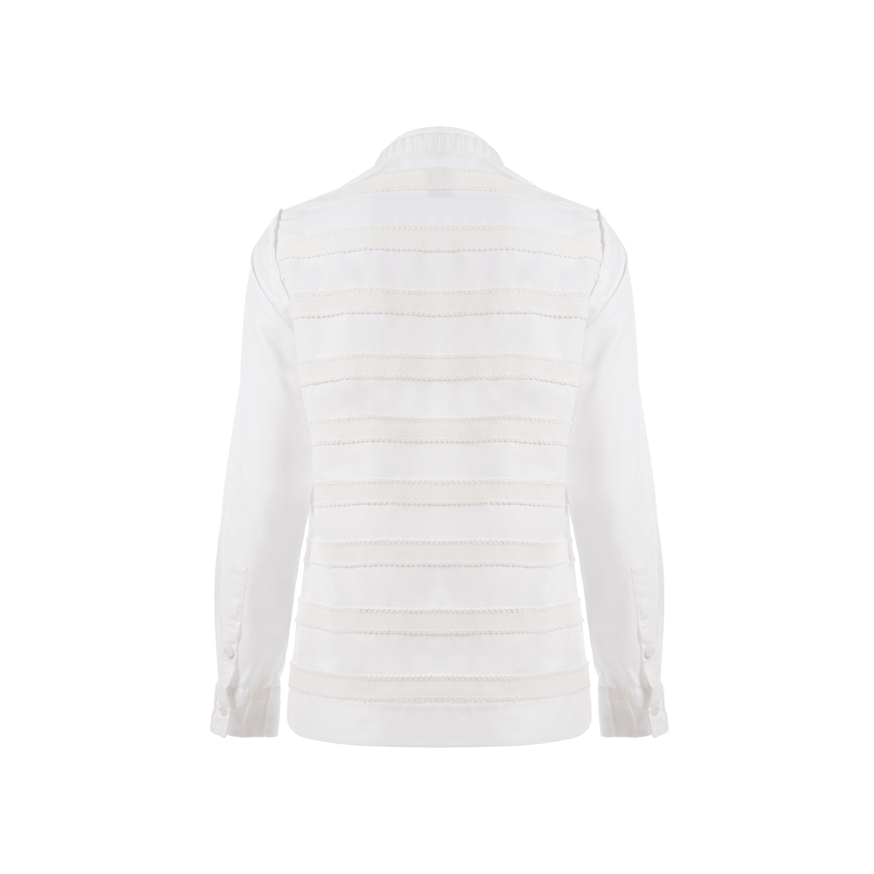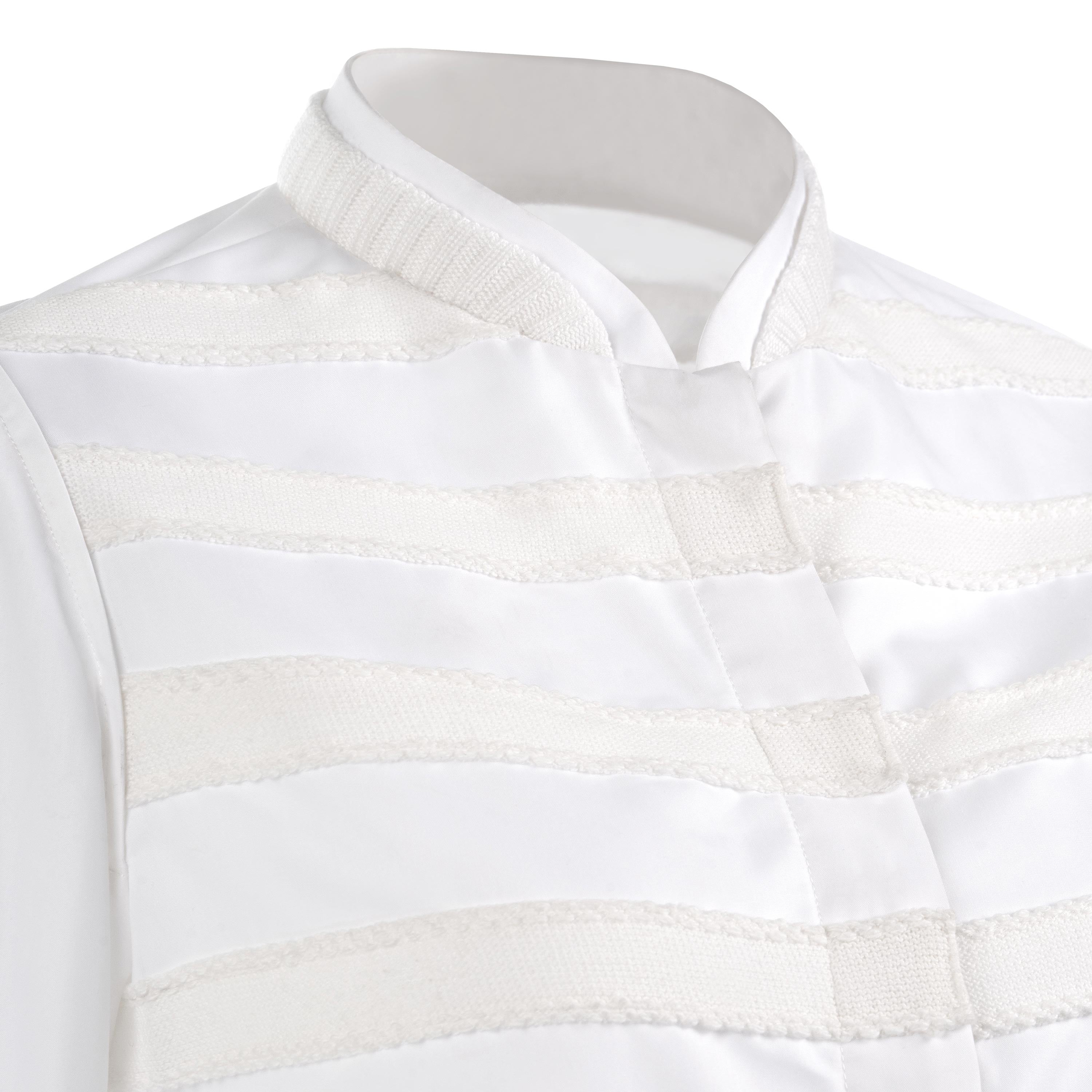 A shirt with a double collar and ribbed accents on its outer layer, featuring hidden buttons and layered stitching at the armholes. Additionally, it includes knitted panels sewn into cotton fabric as detailing for the body and cuffs.