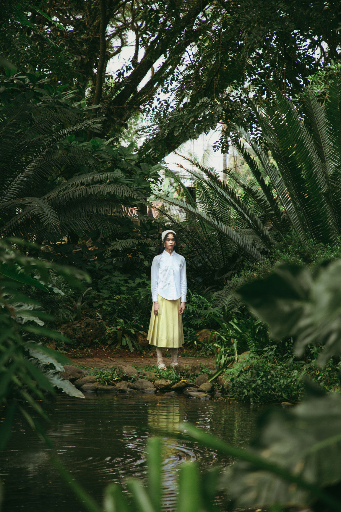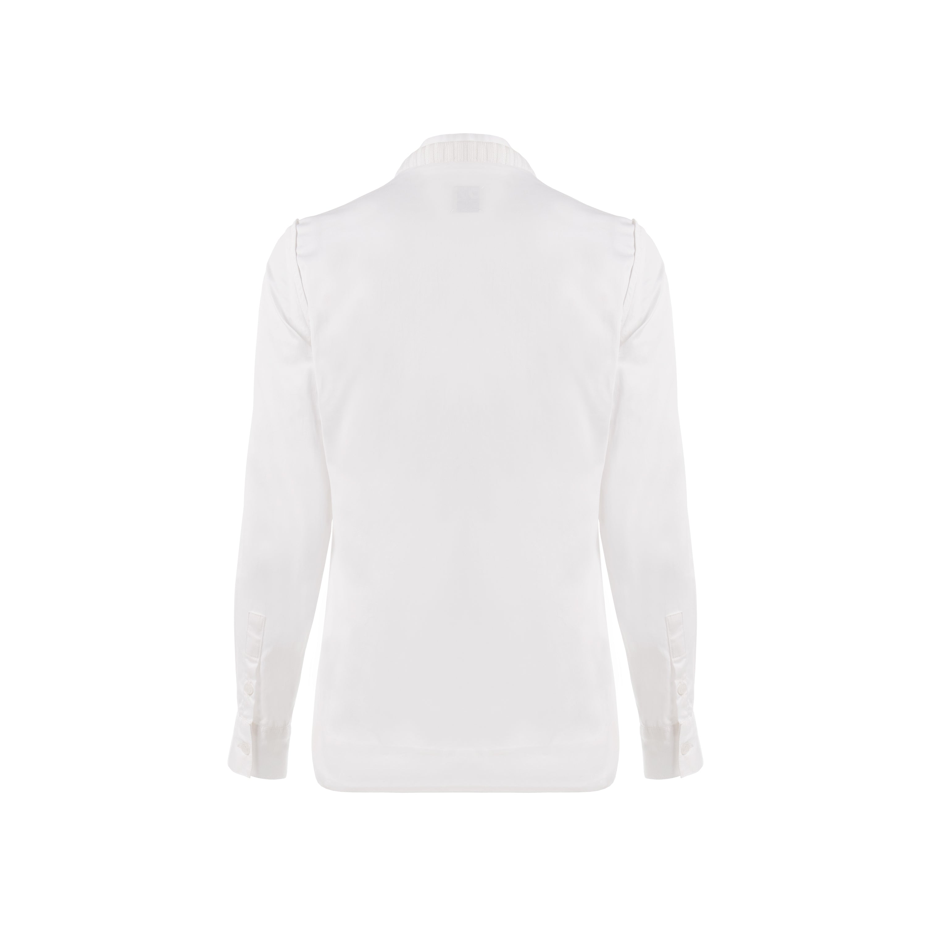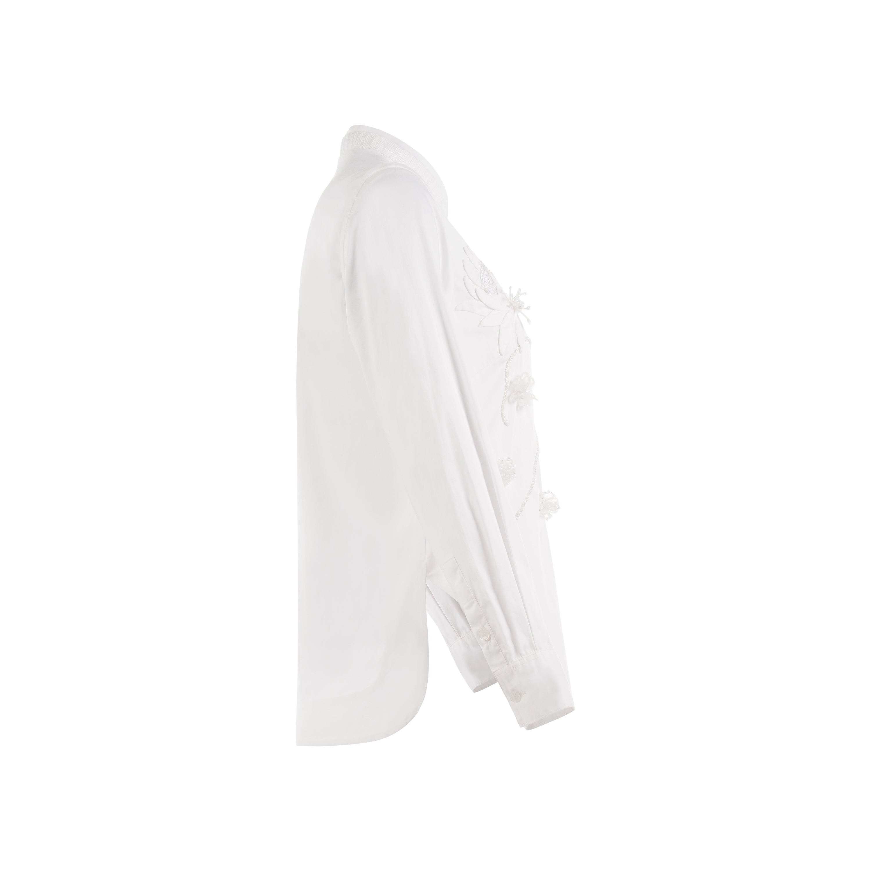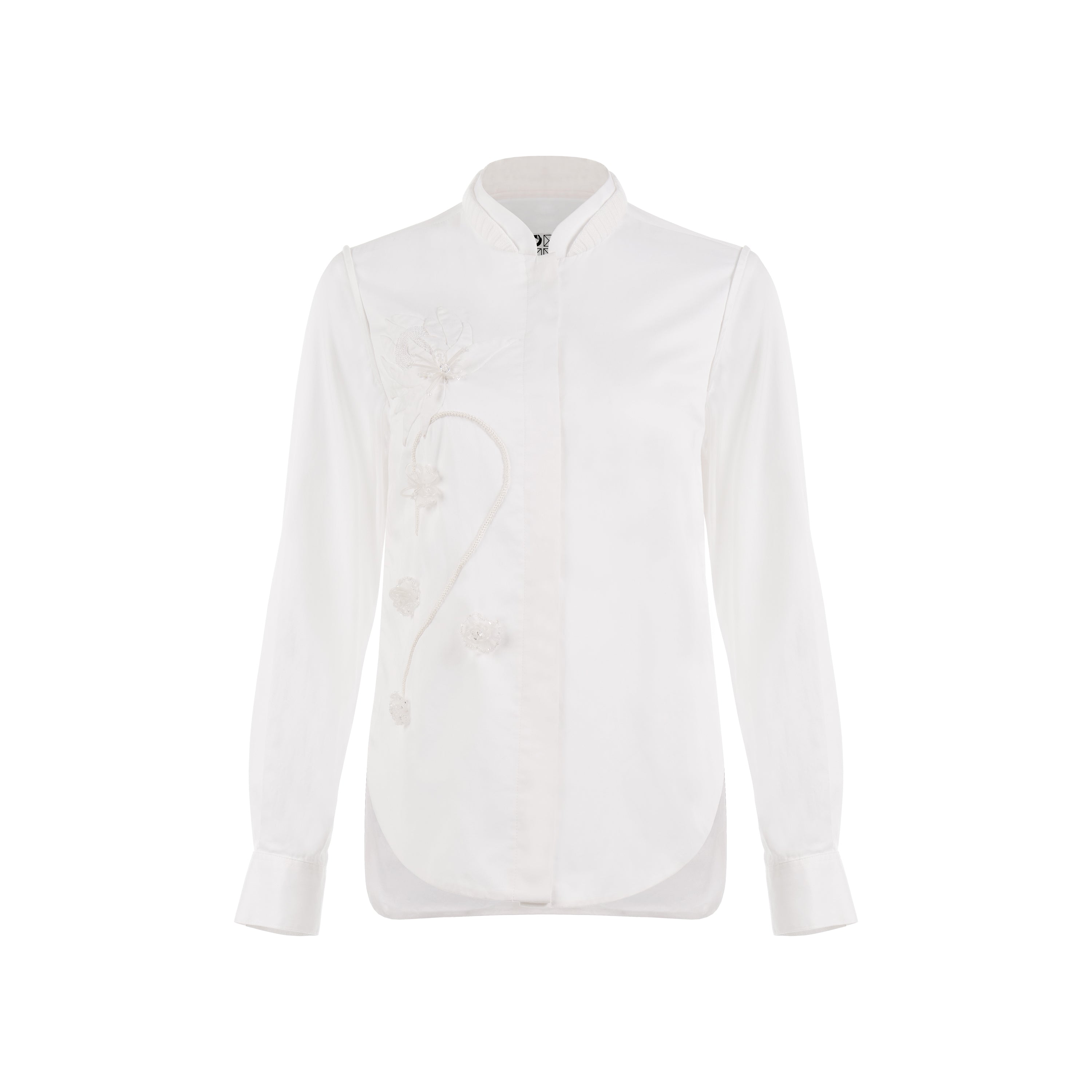 A shirt with a double collar and ribbed accents on its outer layer, hidden buttons, layered stitching at the armholes, and hand-sewn flower details on the abdomen with 3D embellishments.